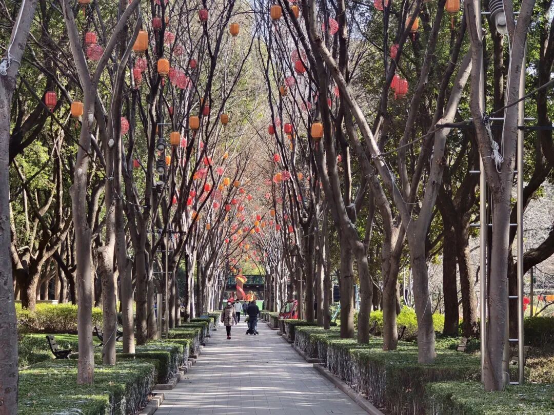 上午十点,徐家汇公园里热闹非凡,人流如织。不少游客趁着这好天气来此散步散心,家长们带着孩子涌向儿童游乐设施,享受亲子时光。公园林荫道旁,树上挂满了红彤彤的灯笼,在阳光直射下,颜色愈发鲜艳夺目。喜庆的灯笼与冬日晴空相互映衬,为公园增添了一抹亮色,也弥漫出浓浓的年味。