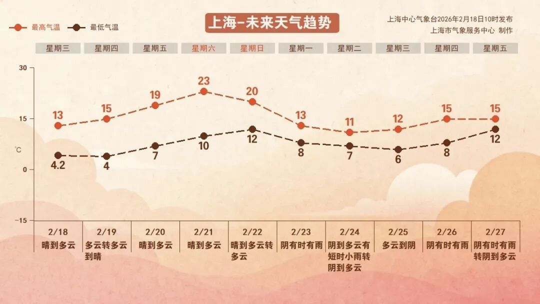 上海中心气象台预计,受高空西北气流影响,未来三天天气以晴到多云为主,气温呈逐日回升态势。明晨受辐射降温影响,气温依旧低位运行,到初五和初六两日,最低气温将重回10℃以上,初五暖至顶峰,日最高气温或将达到23℃。大回暖后,冷空气又悄然而至,初七前后,受冷空气影响,本市再度迎来大风、降温和降雨天气,提醒市民朋友多多留意近期天气报道。
