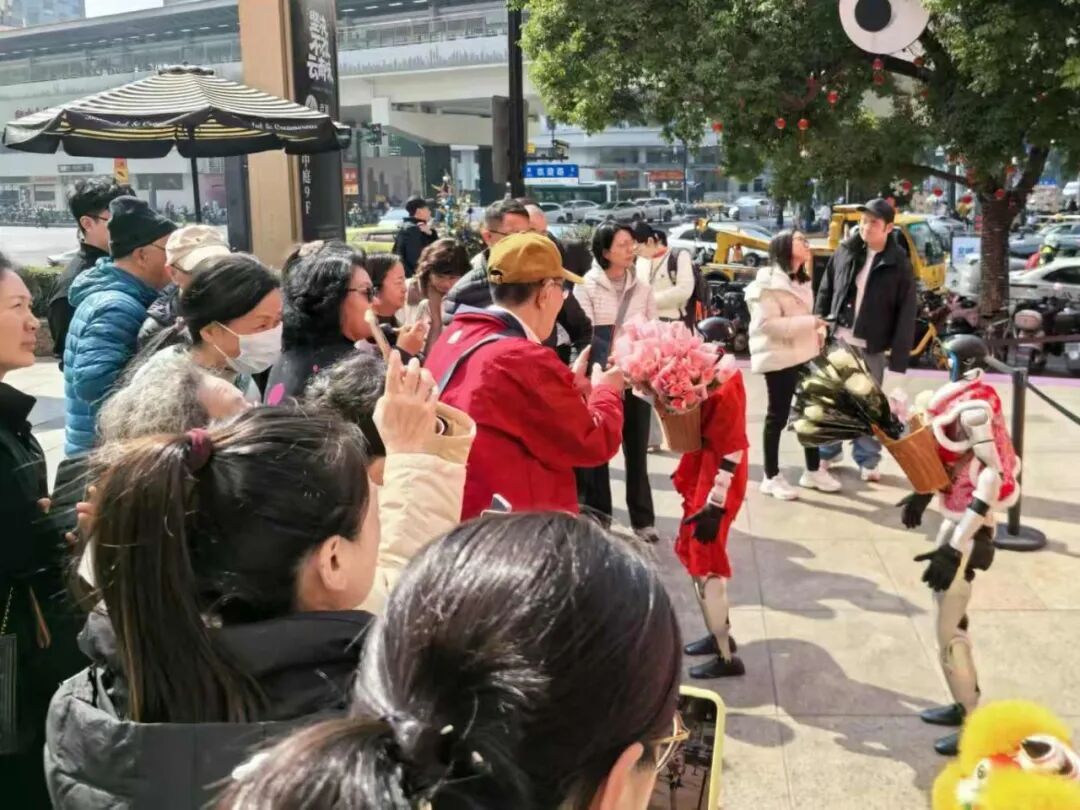 在龙之梦城市生活中心,满目皆是喜庆的“中国红” 。科技感十足的机器人,灵活地送出各式鲜花,吸引市民排队领取。刚刚接过这份特殊礼物的王老伯对此赞不绝口:“活了这么大岁数,还是头一回收到机器人送的花,意义特殊!”
