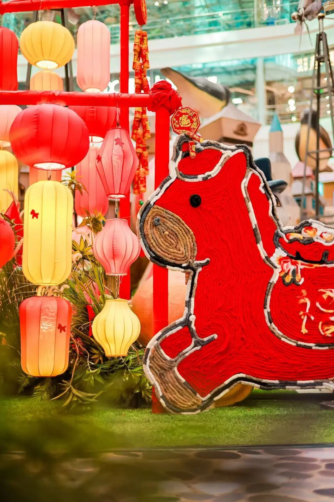 来到虹桥南丰城,“荒野之国”展览区域和丰尚街均换上了限定“红装”,这座充满奇思妙想的童话王国被福气灯笼、中国结装点得年味十足,萌趣小马雕塑与国潮装置错落其间,成为市民争相打卡的“出片圣地”。