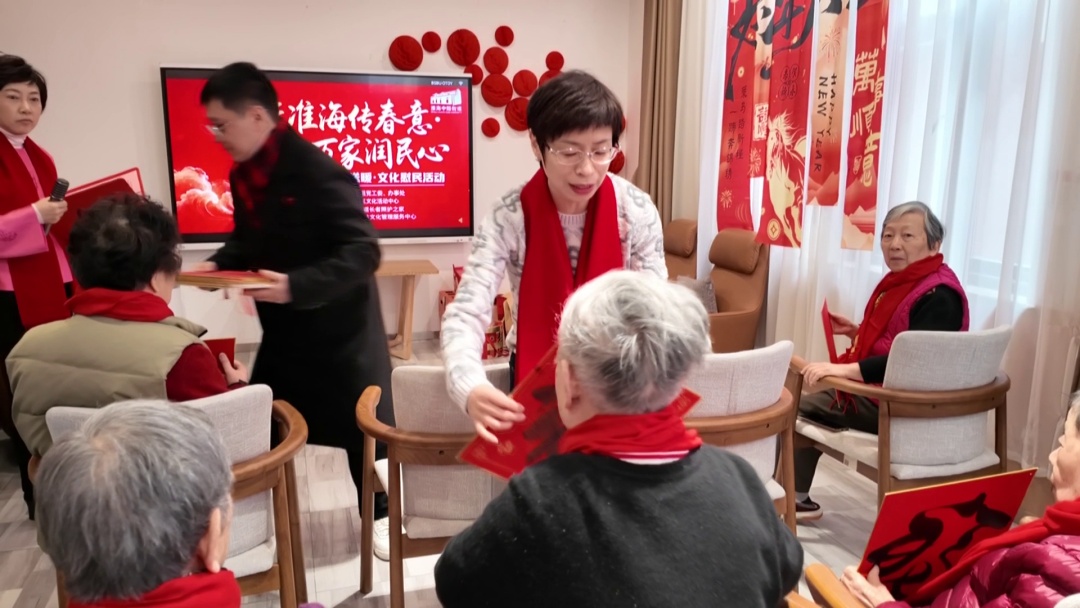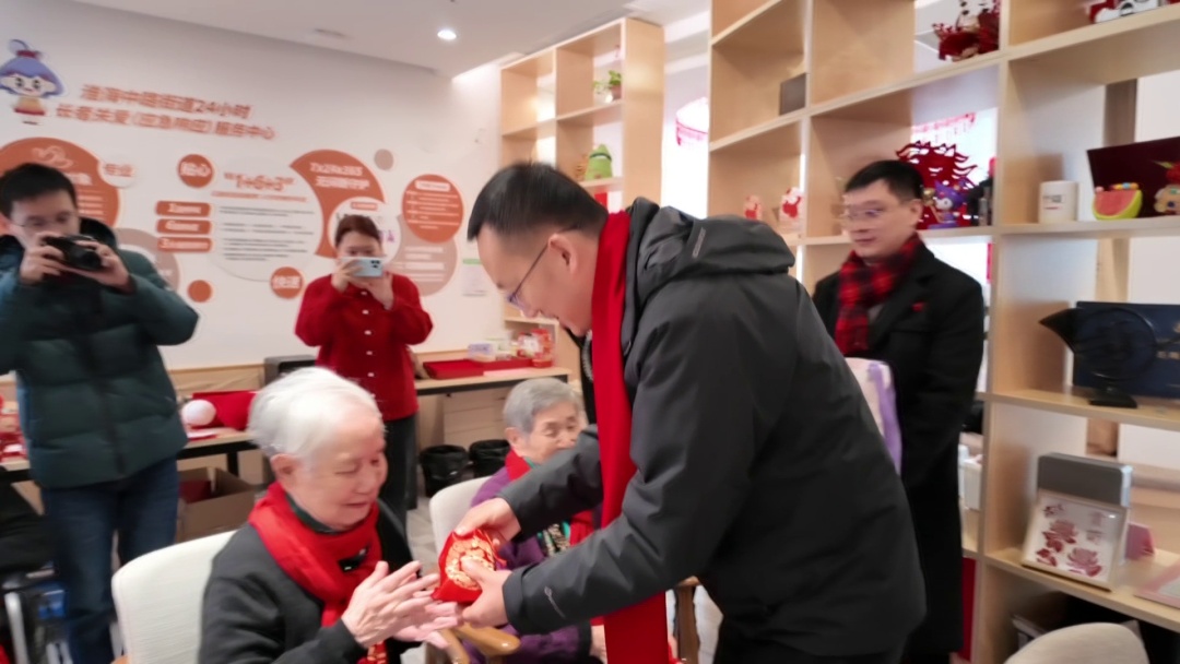 当天上午,淮海中路街道“马跃淮海传春意、福临万家润民心”新春送暖文化慰民活动正式开启。在街道长者照护之家,主办方为老人送上了福袋和文创产品,祝福老人健康长寿。