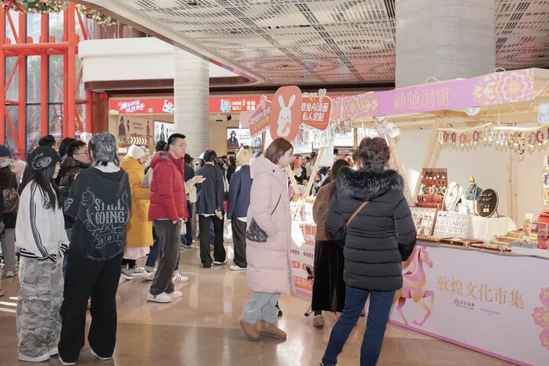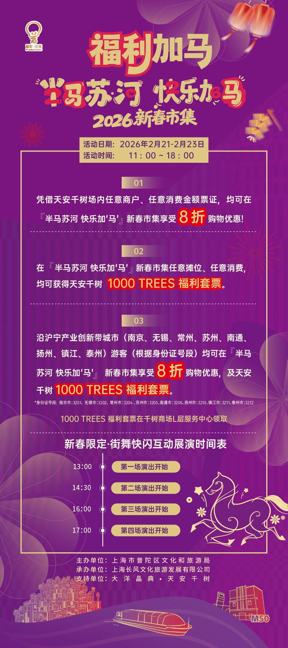 正月初三,阳光和煦,苏州河畔的昌化路桥上人流不息。几位来自俄罗斯和泰国的年轻游客正举着手机,以大洋晶典·天安千树为背景拍照——这座由英国设计师托马斯·赫斯维克设计的“空中森林”,层层叠叠的露台种满绿植,自落成以来便在海外社交平台上频频出镜,成为不少国际游客来沪必打卡的地标。 来自河南的李洛一家则是在苏州河游船上发现这处“景点”。“坐船经过时小孩突然喊‘那栋楼长了好多树’,我们就决定过来看看。”李洛介绍,今年全家来上海旅游过年,原本只规划了外滩、豫园等常规路线,天安千树是“意外发现的惊喜”。 走进商场,年味更浓。L层中庭,敦煌文化市集·飞天奇遇正在举行——复刻莫高窟藻井纹样的中心装置、飞天纱幔、莲花灯箱,营造出浓郁的敦煌风情。20家特色摊位汇集陶瓷、香薰、茶叶、书画剪纸等好物,市民穿梭其间,挑选年礼。 “特意带孩子来看敦煌市集,没想到还能体验非遗剪纸。”在摊位前选购的市民王小小,家就住在附近,春节这几天已经来了两趟:“每次逛都有新发现。” 商场内的团购活动将持续至2月23日。消费者通过美团、大众点评App可抢购25元团40元小食券、450元团500元服饰券;抖音平台则推出1000元团1100元黄金珠宝券。会员消费满266元可领取“马上有福”毛绒钥匙扣,消费满4222元并积分,凭3800积分即可兑换周大福生肖马黄金挂绳,活动持续至2月22日。在服务台兑换毛绒钥匙扣的市民陈娟表示:“吃的穿的用的都有优惠券可以选,非常好。” 商场还与奥乐齐超市联动,推出消费满500元赠100元餐饮券活动,可在韩金岚、Latina等热门餐饮门店使用,实现年货采购、新春聚餐一站式体验,消费券可使用至2月23日。商场工作人员介绍,这一联动促消费成效明显,假期以来热门餐饮常常需要排队。 而即将到来的2月21日至23日(正月初五至初七),千树河滨步道将化身为一座“可触摸的中国技艺博物馆”,由区文旅局推出“半马苏河 快乐加‘马’”新春市集,汇集沪宁沿线城市非遗好物、年俗文创,南京绒花、常州缠花、苏州苏绣等非遗摊位依次排开,与商场形成消费联动,可获得1000 TREES福利套票,包含餐饮、健身、娱乐项目等折扣优惠。同期还将有国际舞者快闪互动表演,每日四场,时间为13:00、14:30、16:00、17:00。 此外,一匹“瑞境·鸿运马”装置也在滨河步道昂首迎客,市民可参与由上海普陀文旅发起的“龙马精神游普陀·打卡新春赢福礼”主题活动,在普陀区内拍照打卡马年艺术装置,有机会赢取“半马苏河”马年文创。 记者:施旖雯 编辑:吴锴 点击下方了解更多 普陀 你好 | 年味盈市,货满春集 每日猜猜猜!大年初三,解锁普陀“水墨盲盒”,领取新年好运签! 【提示】平安过年有诀窍:出门前做好“三清三关” 【新春活动日历⑤】福券狂欢、双城开跑,普陀新春盛宴邀你嗨玩一整月 从苏州智造到普陀认证再到春晚出圈,这条沿沪宁产业创新带有多强?
