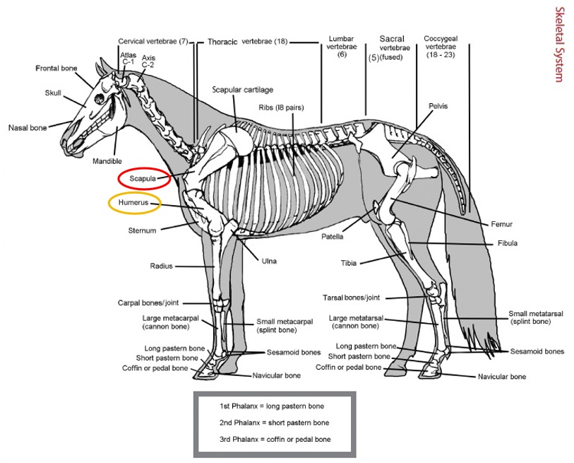 马的骨骼结构图:红圈为肩胛骨,黄圈为肱骨
