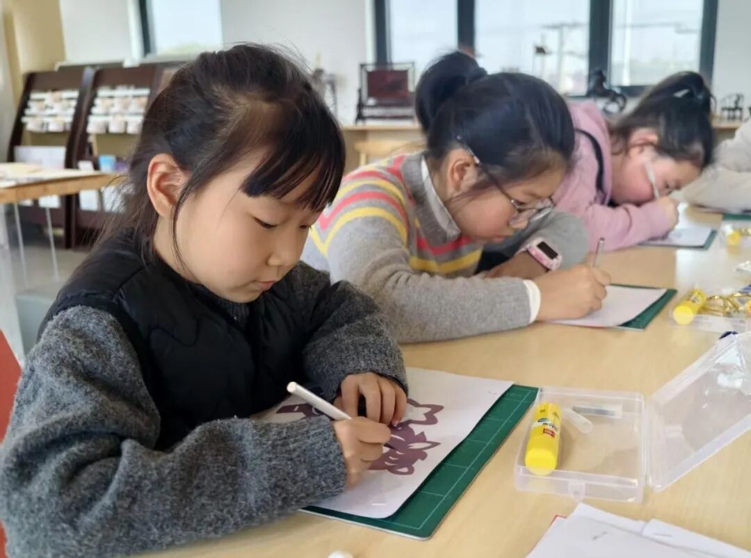 眼前的这位指导老师是“奉贤乡土纸艺”奉城刻纸的区级代表性传承人冯盼盼,今天她为这几位学生准备了难易程度各不相同的刻纸模板,并且给学生们介绍了刻刀的具体用法和技巧。在仔细聆听了制作过程后,学生们便开始刻画自己的马年作品。