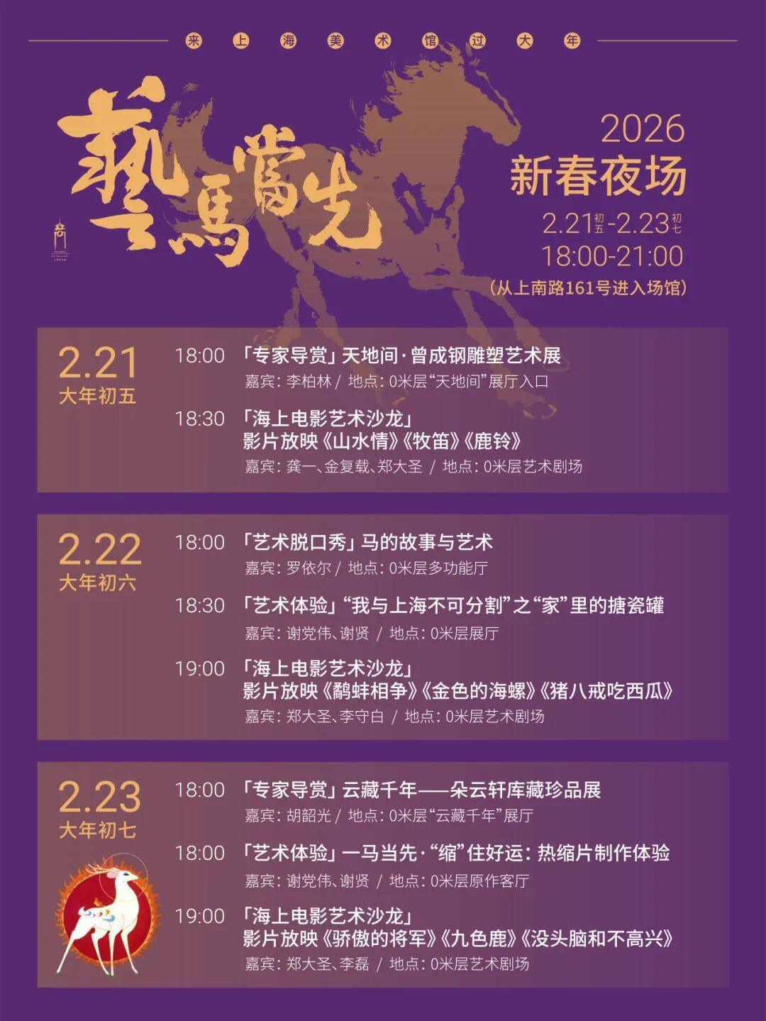 春节不打烊,上海美术馆精彩继续!年初五到初七晚上,馆内不仅将放映《九色鹿》《山水情》《没头脑和不高兴》等承载几代人童年回忆的经典动画佳作,更搭配民乐演奏与映后鉴赏会,特邀著名导演郑大圣、作曲家金复载、古琴演奏家龚一等名家,陪您度过充满诗意与中国美学的新春夜晚。(点击查看详情并预约:活动 | 2026春节夜场:流影清音·美术动画新春夜!来上海美术馆过一个有光影与诗意的年)