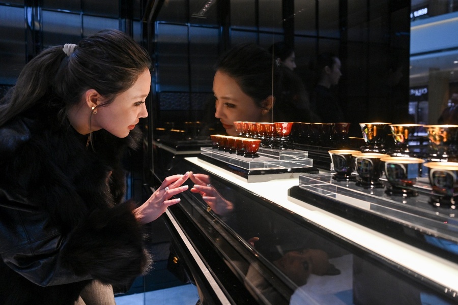 中式金走俏,不少品牌也趁势在春节期间推出更多融入传统文化内涵的活动,传递东方黄金美学。老铺黄金在恒隆广场带来“传世经典,传世生活——老铺黄金经典作品展”,主打展品“十二月花神漆器螺钿金杯”,将足金与漆器螺钿工艺融合,取型于清康熙年皇家瓷器“十二月花神杯”,每件杯子外壁描绘有十二个月份应时花卉,并题咏花诗句,别具雅趣。周生生在港汇恒隆广场呈现“游启新岁,全盒纳锦”新春艺术装置,以标志性鱼纹为艺术语言打造沉浸式场景,如同一件盛满祝福的珠宝盒,将黄金珠宝的精致质感与东方祥瑞寓意相融合。