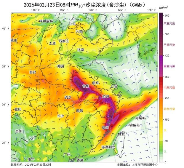 市生态环境局介绍,2月21日,我国西北地区出现大范围沙尘天气,多地出现重度至严重污染水平。根据最新预测预报情况,22日凌晨起,沙尘气团开始影响长三角地区,预计中午前后影响本市,出现短时中度及以上污染过程;23日凌晨,本市主导风向转为东北风,沙尘气团逐渐过境,中午前后沙尘影响基本结束,空气质量好转为优良。