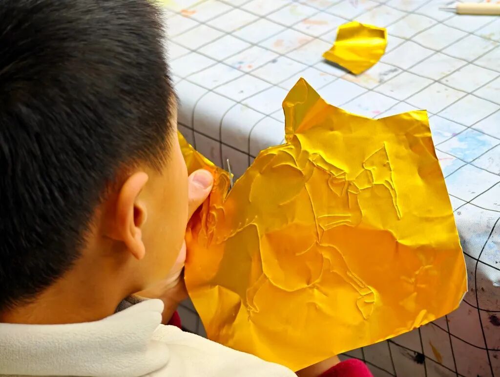 活动尾声,一幅幅带着指尖温度的錾刻锡纸画整齐陈列,有的描绘着骏马奔腾的壮阔景象,有的点缀着新春福字的吉祥寓意,有的融入了孩童天马行空的想象,色彩鲜亮、纹路细腻,成为这个新春佳节最别致的装饰。“这是我和妈妈一起做的,我要把它贴在家里最显眼的地方,让大家都看看我的作品,也让大家知道錾刻这项非遗技艺有多厉害。”小朋友们举着自己的作品,骄傲地向身边的人展示,脸上洋溢着幸福的笑容。