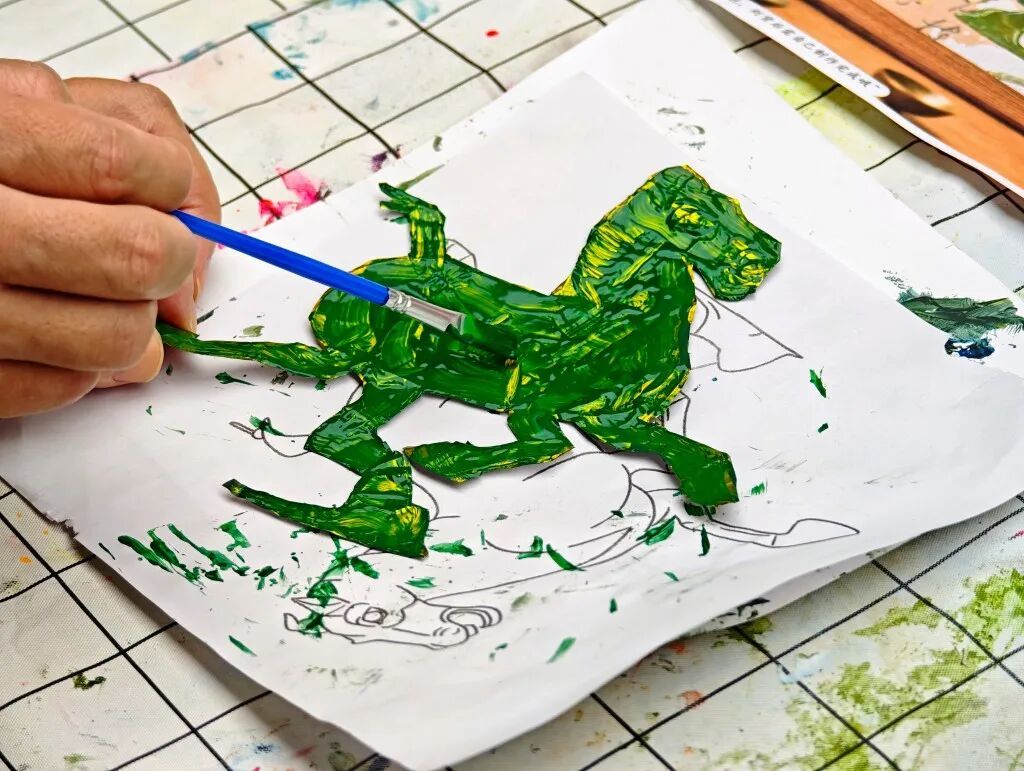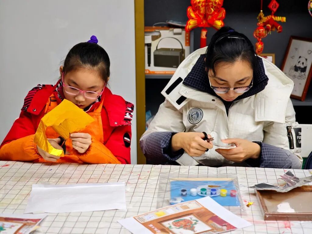 在实践环节,特制锡纸、环保酒精胶、骏马祥纹线稿、色彩鲜亮的颜料……一个个精致的材料包分发到每组亲子手中。家长与孩子围坐成圈,暖意融融,以骏马祥纹为蓝本,在指导老师的耐心带领下,拿起特制工具,小心翼翼地按压、划刻。一按一划间,骏马奔腾的矫健姿态、缠绕其间的吉祥纹样、点缀其中的新春元素,逐渐在锡纸上鲜活起来,每一幅作品都独一无二,承载着亲子间的温情与对马年的美好期许。