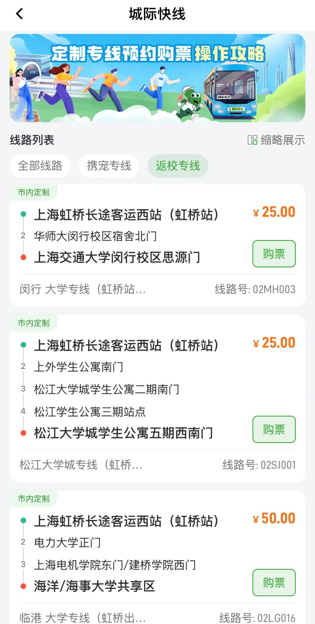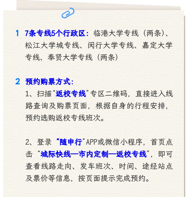 2. 登录“随申行”App或微信小程序,首页点击“城际快线—市内定制—返校专线”,即可查看线路走向、发车班次、时间、途经站点及票价等信息,按页面提示完成预约。