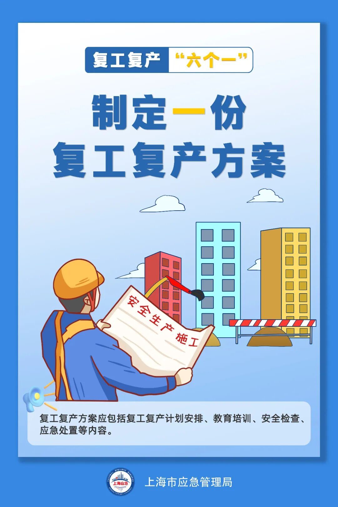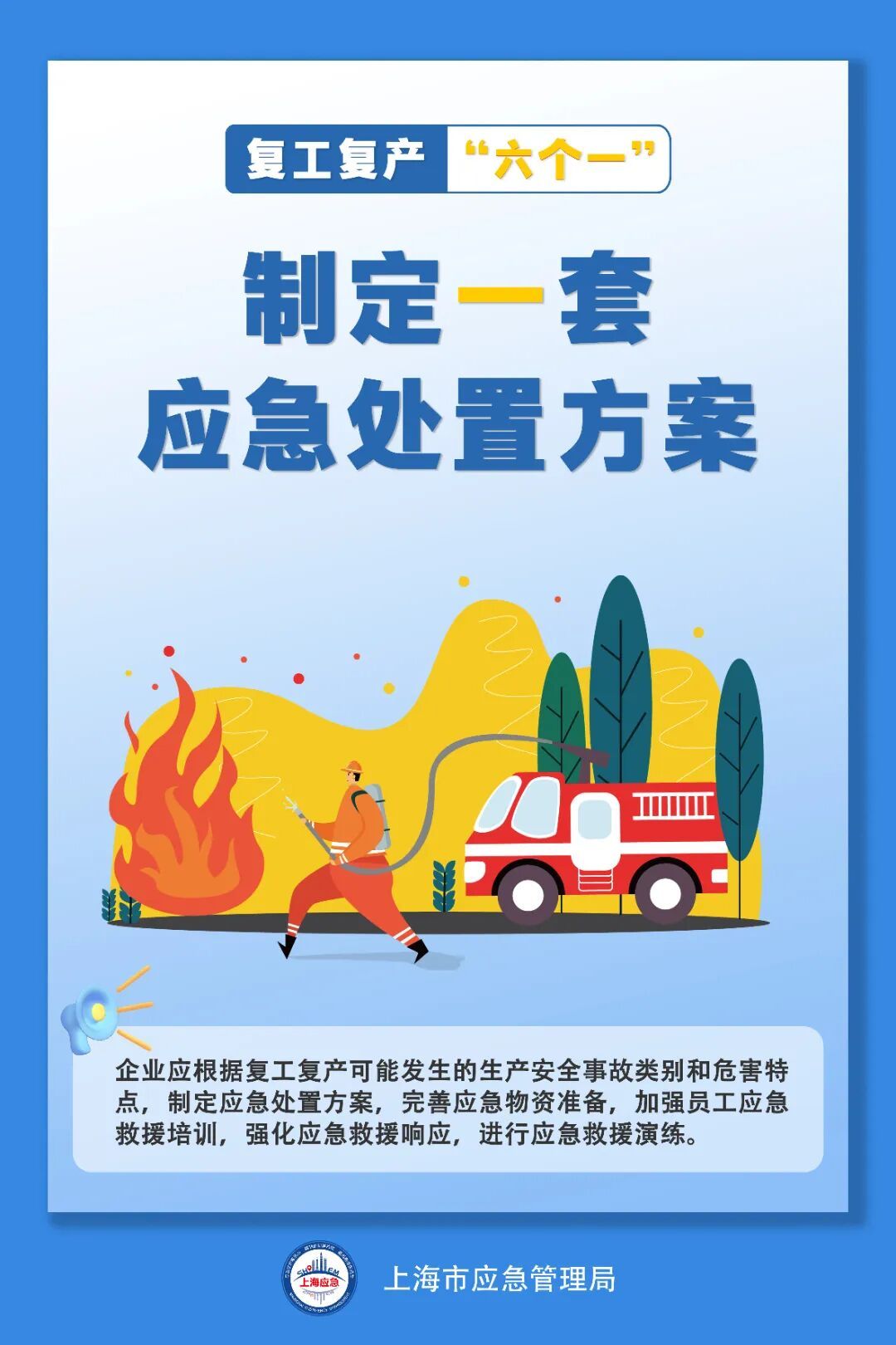 三、修订完善预案,全力提升应急救援能力。各单位要结合生产实际,制定周密的复工复产工作方案和配套应急处置预案,针对性开展应急演练,加强员工应急救援知识和实操技能培训,强化应急救援响应能力。一旦发生突发情况,要第一时间科学处置、及时上报,最大限度减少人员伤亡和财产损失。