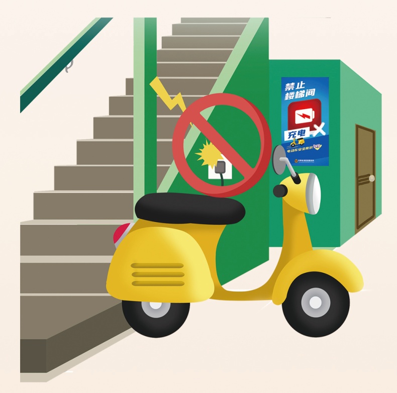 3.切勿在走道、楼梯拐角、地下室堆放杂物;电动车不应在楼梯间、疏散通道、安全出口处充电,充电时不得时间过长,且周围不得有可燃物。应保持消防通道、安全出口、疏散通道畅通。