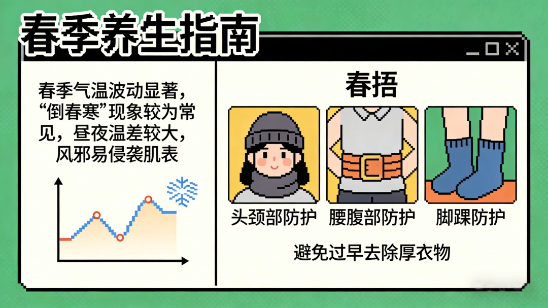 春季气温波动显著,“倒春寒”现象较为常见,昼夜温差较大,风邪易侵袭肌表。“春捂”非常,应着重对人体的头颈部、腰腹部、脚踝等部位进行防护,避免过早去除厚衣物。
