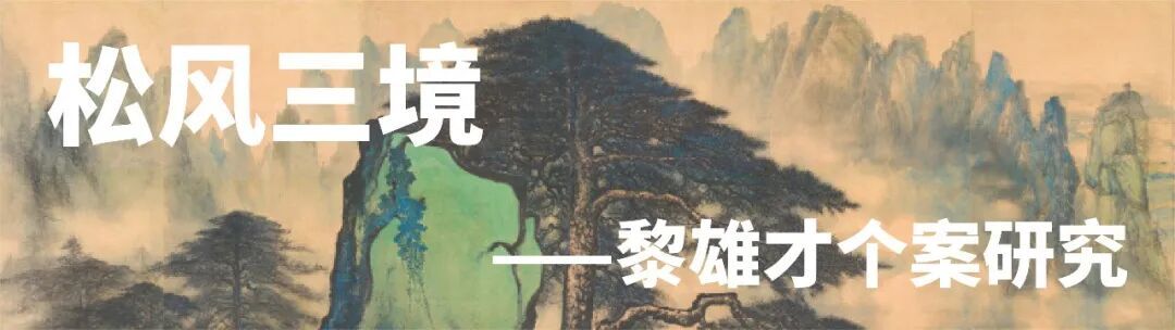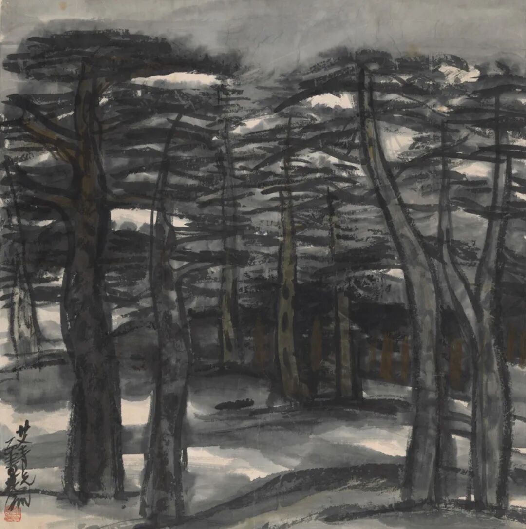 画面描绘了苍松耸立的景象。画家以粗笔勾绘树干,浓墨涂抹松枝,再以淡墨或掺以赭色晕染树干。松树参天立地,造型古拙,相互掩映充塞画面,画幅上方微露阴暗的天空,整个画面显得苍凉朴拙,不同于林风眠其他类型画作那种优雅唯美的风格。画面采用方纸布阵,满构图,中近距离取景,被描绘对象显得鲜明突出,这得益于西方现代美术的构图与关照模式;而以中国式笔墨皴擦的松枝,以墨色晕染和留白共同呈现的天空背景,又让观众看到传统元素的运用;同时画家墨中参色,大胆将西式的色彩运用于宣纸之上,画面色彩显得浓厚、饱满、沉着。这种中西融合的方式,显示了林风眠探索中国绘画现代化的努力。