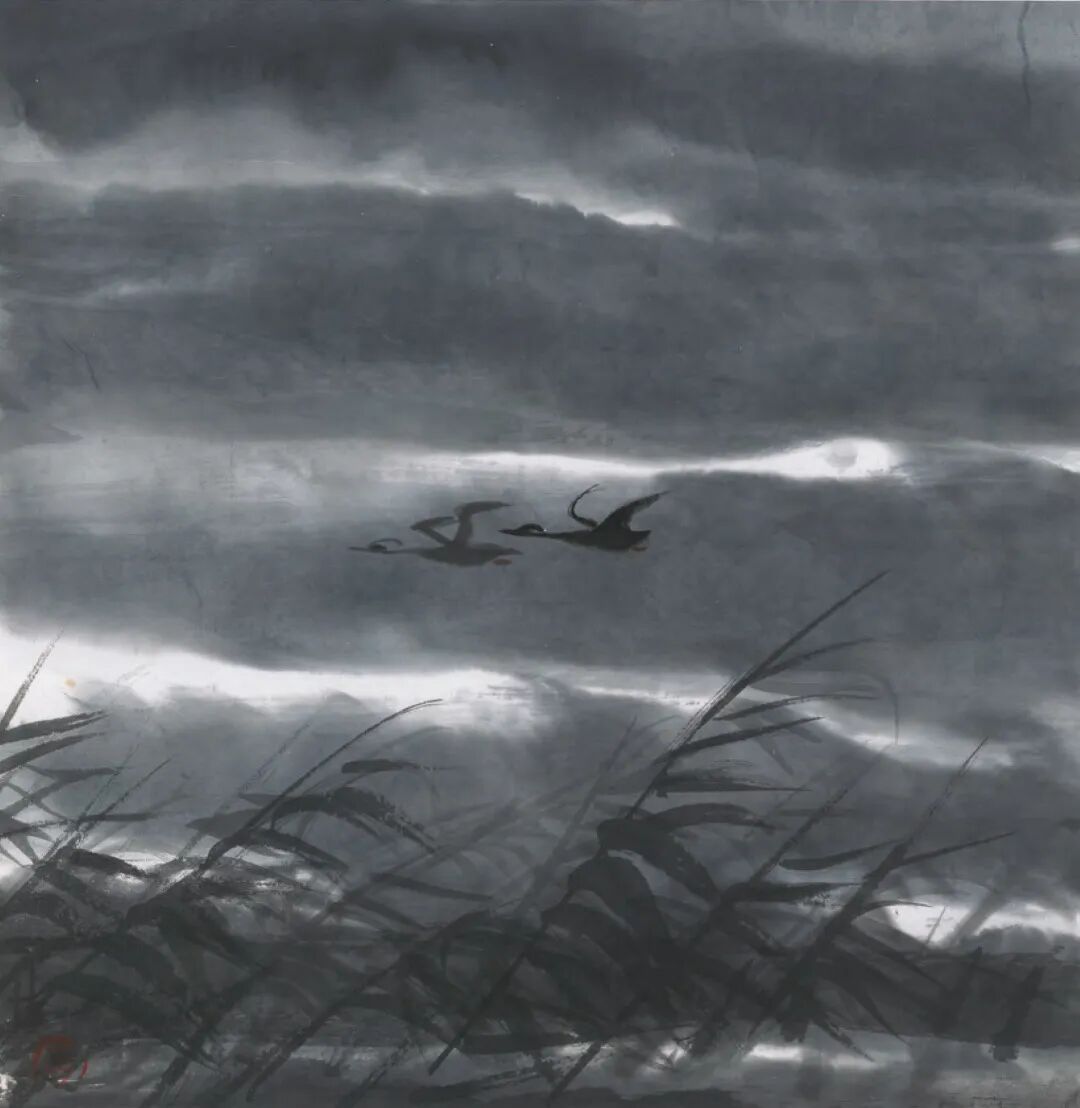 画家以浓墨横扫,天空、沙渚、水面由上而下平行展开,天幕低垂,阴云密布;近景中墨色的芦苇以迅疾锐利的线条勾绘,顺风偃抑,虽然纤细,却尖锐、挺拔;芦苇参差起伏的纵向排列,与横涂的天空、沙渚、水面相穿插,打破了横向的秩序,形成变化。沙渚之上,两只剪影似的芦雁低空掠过,小小的禽鸟逆风而行的姿态将一种充满张力的生命之美灌注于阴沉压抑的画面之中。画面整体氛围阴郁,透露出画家孤寂、悲凉的情怀。这幅画具有浓郁的传统水墨韵味,但在构图、画法上又有别于传统。它采用方纸布阵,通过锐利的线条与墨色团块之间的穿插,将横与纵、静与动、线与面、黑与白等对立的元素和谐统一起来,形成画面的交错之美。
