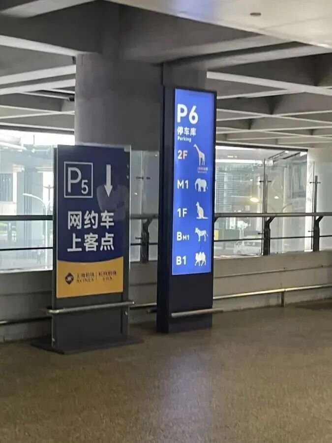 虹桥机场2号航站楼的停车库位于与2号航站楼相连的东交通中心内。东交通中心内设有P6、P7两个小型车停车库。为了方便驾驶员记忆停车点,机场在建造车库时,用萌萌的“动物”“水果”标志代替了以往的数字标志。