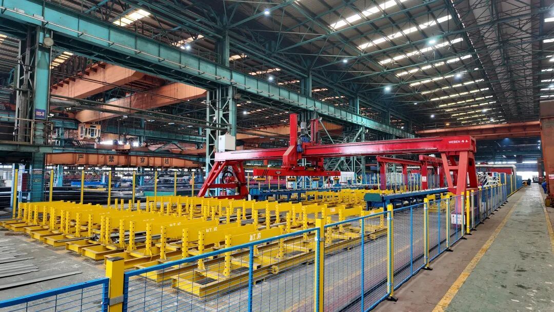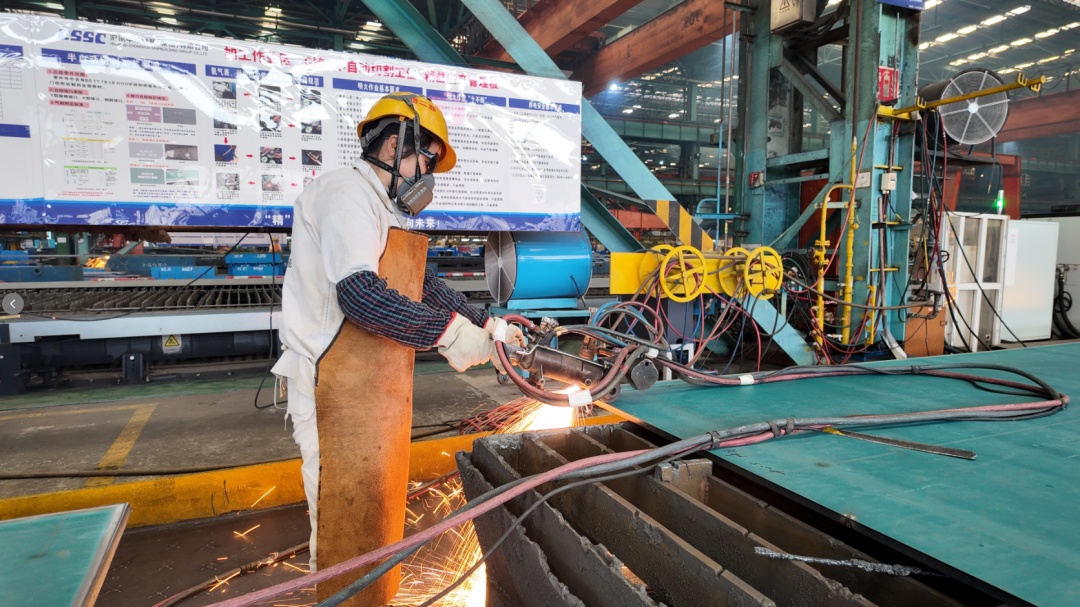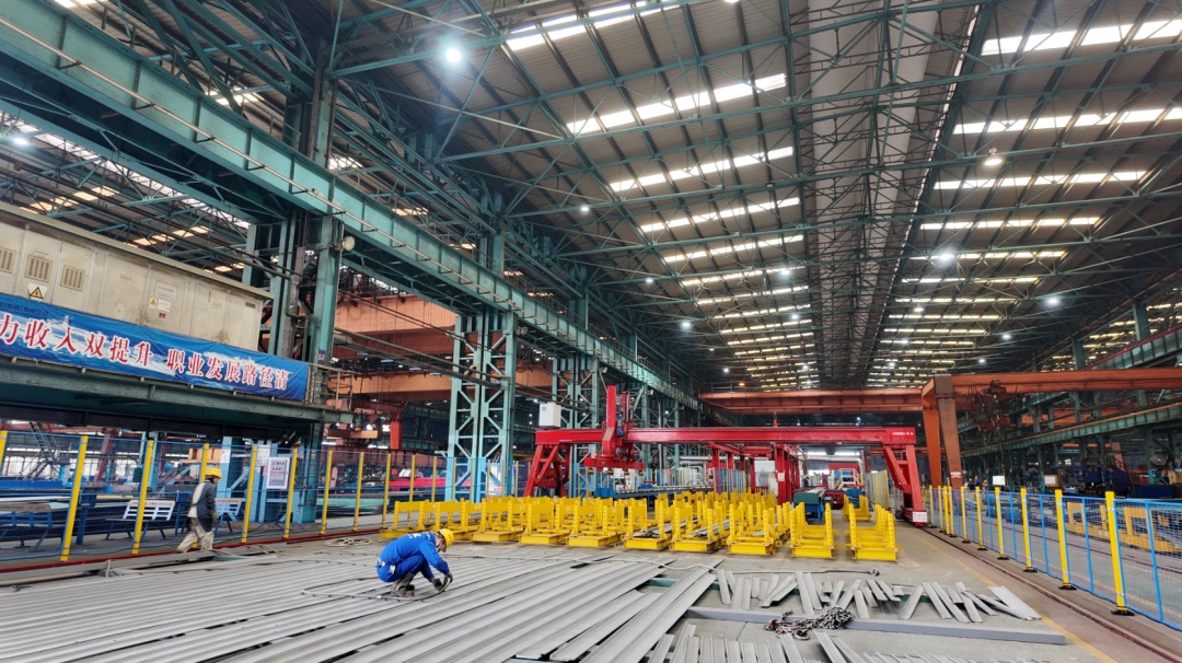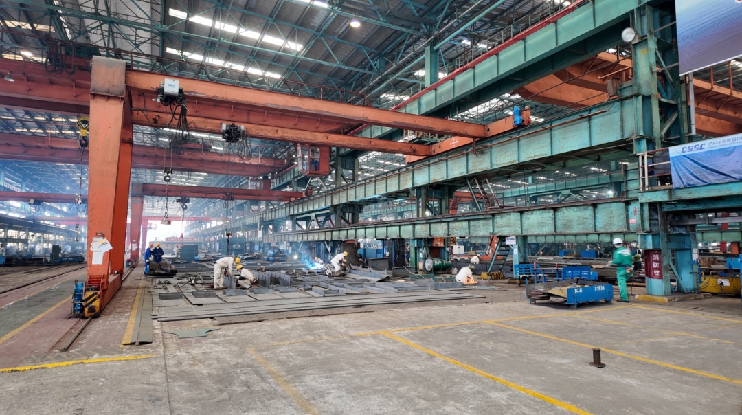 在沪东中华长兴岛厂区平面前道车间,机械轰鸣、焊花四溅,工人们正操纵设备对钢板进行预处理、切割以及初加工;车间内的型钢流水线上,自动化分拣设备正对型钢进行建造、矫正、分拣,各项作业有序开展,处处一片热火朝天的景象。