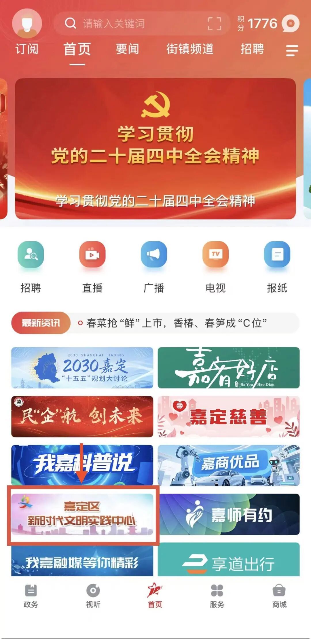 2. 点击首页“嘉定区新时代文明实践中心”。
