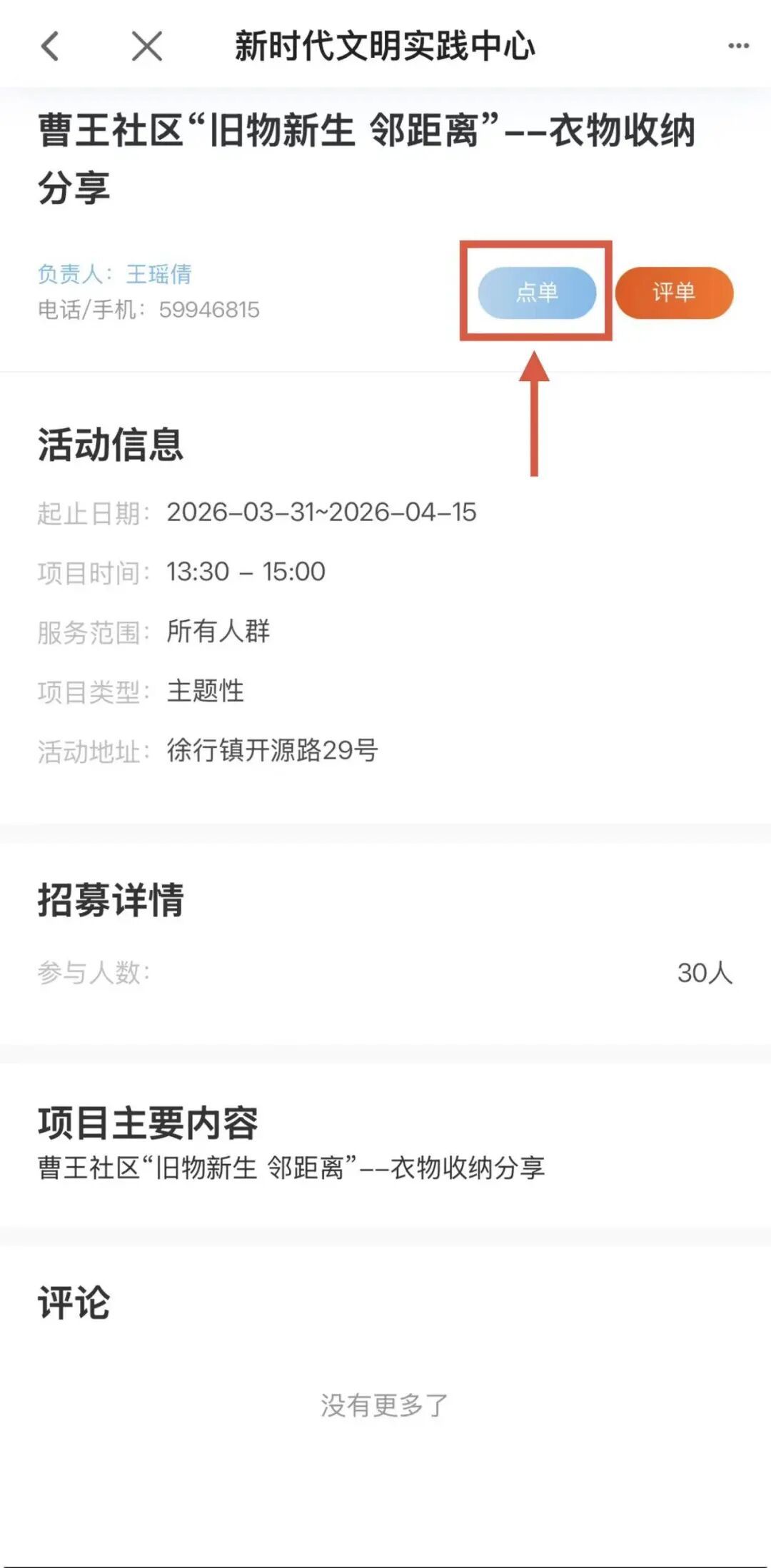 5. 查询活动内容或与联系人沟通并点击“点单”。