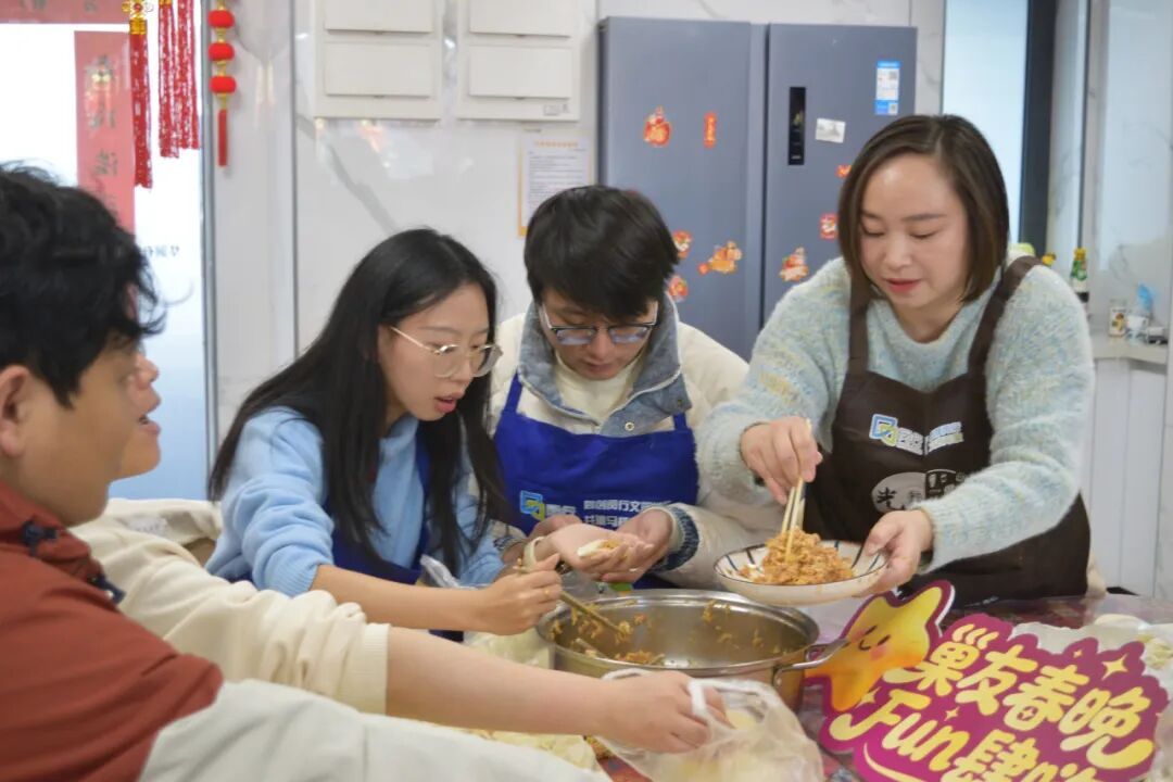 马桥AI店和东部经开区店的年夜饭现场,青年居民们围坐于长桌,和面、擀皮、包馅,边聊边笑。