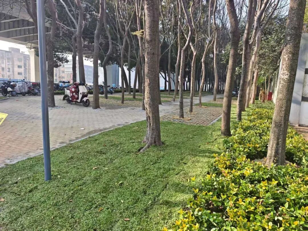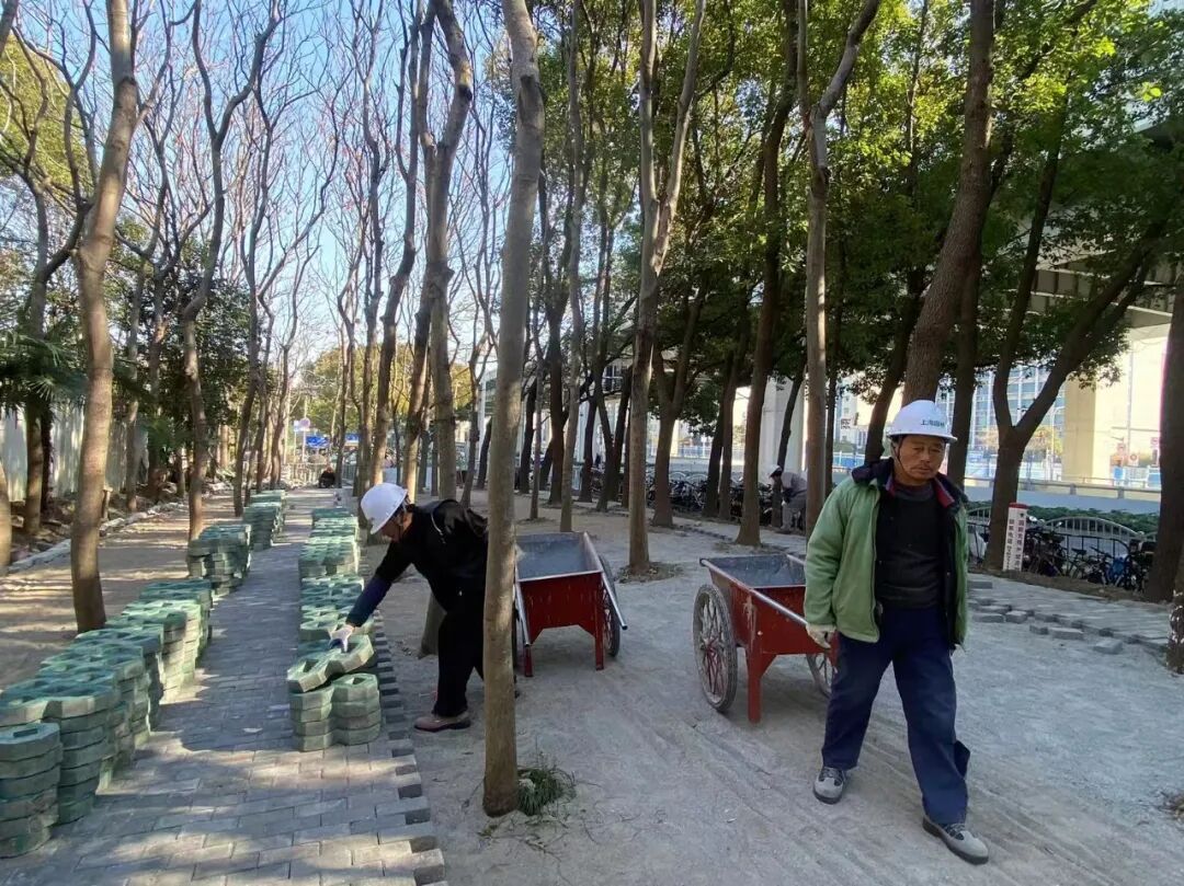 值得称道的是,这场空间扩容并未以生态牺牲为代价,反而通过科学规划实现了“功能与绿意共生”的升级。原场地里长势良好的香樟全部保留,还额外补种了15株苗木,迁移的树木均送至专业苗圃养护,确保绿化覆盖率不降低。施工材料还有特殊“小巧思”,停车区域铺设植草砖,下雨不积水,还能透气透水,真正实现“停车不毁绿,生态不打折”。