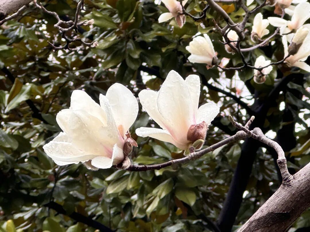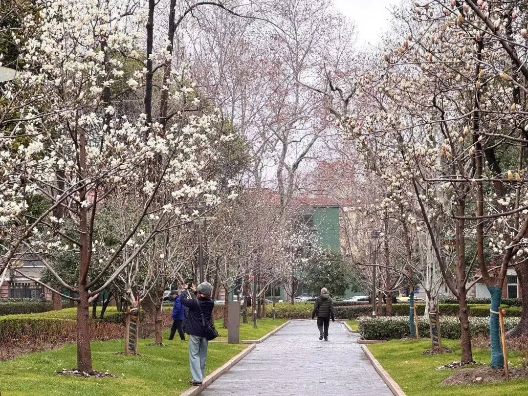 今天上午申城偶有细雨飘落,临近中午雨势渐收,空气清新。徐家汇公园内,白玉兰或含苞或盛放,远看如一群白鸽栖满枝头,近观则花瓣舒展、晶莹如玉,吸引市民驻足拍照。不少家长带着孩子来踏青寻春,园中一角有市民悠闲打着太极,乒乓球桌旁也激战正酣,处处透着生机与活力。
