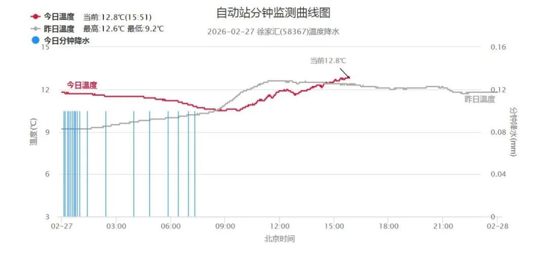 受高空槽影响,昨天夜里申城雨势较为明显,今天白天降水减弱,有时有小雨天气为主,下午起大部分地区雨止转阴天,傍晚时分阳光还短暂的露脸了。市区徐家汇站气温在10.5~12.9℃,全天温差较小。