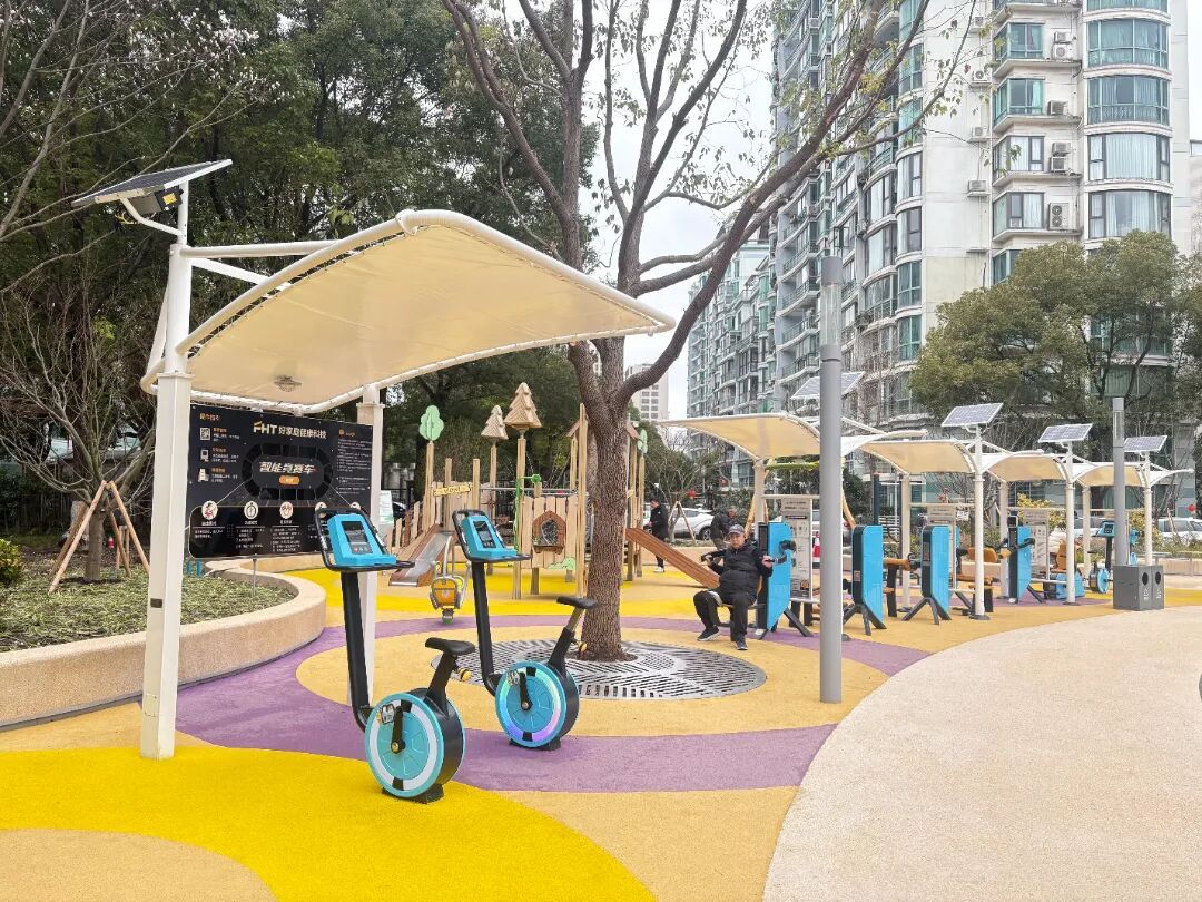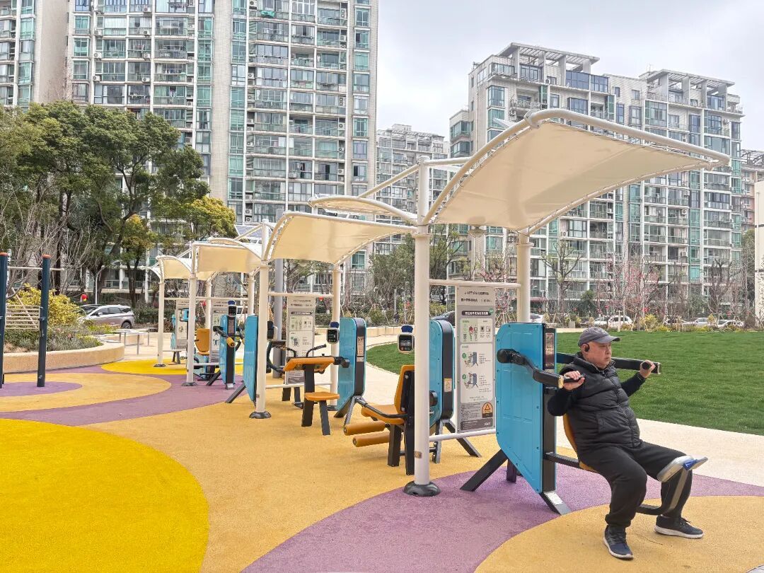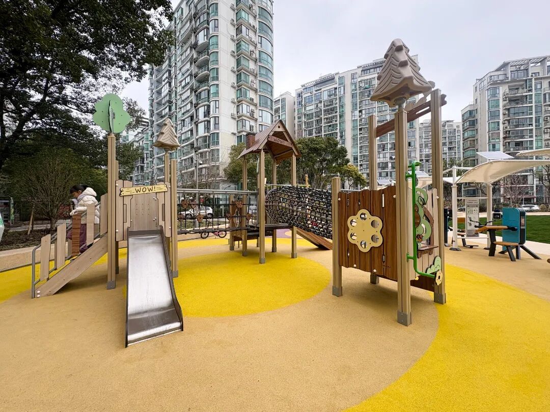 在设施配置上,则处处体现着全龄友好的理念。西南角的儿童游乐区和健身区,既有适合孩童攀爬嬉戏的组合滑梯、秋千,也涵盖力量训练、有氧训练等多种功能的新型智能健身器械,器材选用环保耐用的材质,部分还带有缓冲设计,最大限度保障使用者的安全。