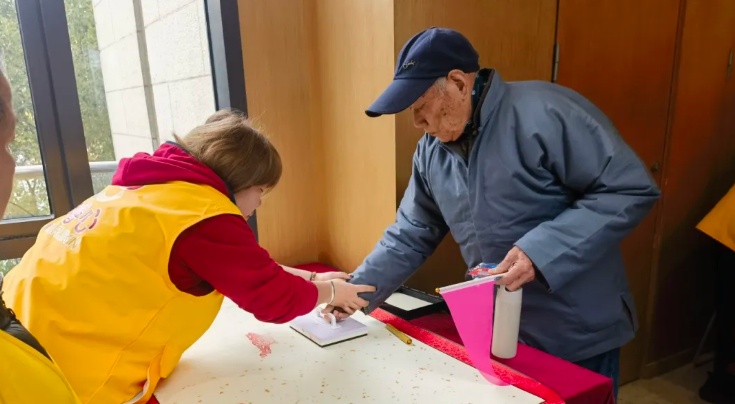活动现场布置年味十足,红色马年印章长卷轴、元宵主题拍照墙、五彩眼镜和趣味手牌一应俱全,营造出浓厚的节日氛围。老人们陆续入场后,在签到区挑选喜欢的印章,在卷轴上留下印记,写下新春祝福并签名留念。摄影师为大家定格下这温馨瞬间,活动在欢声笑语中正式拉开帷幕。