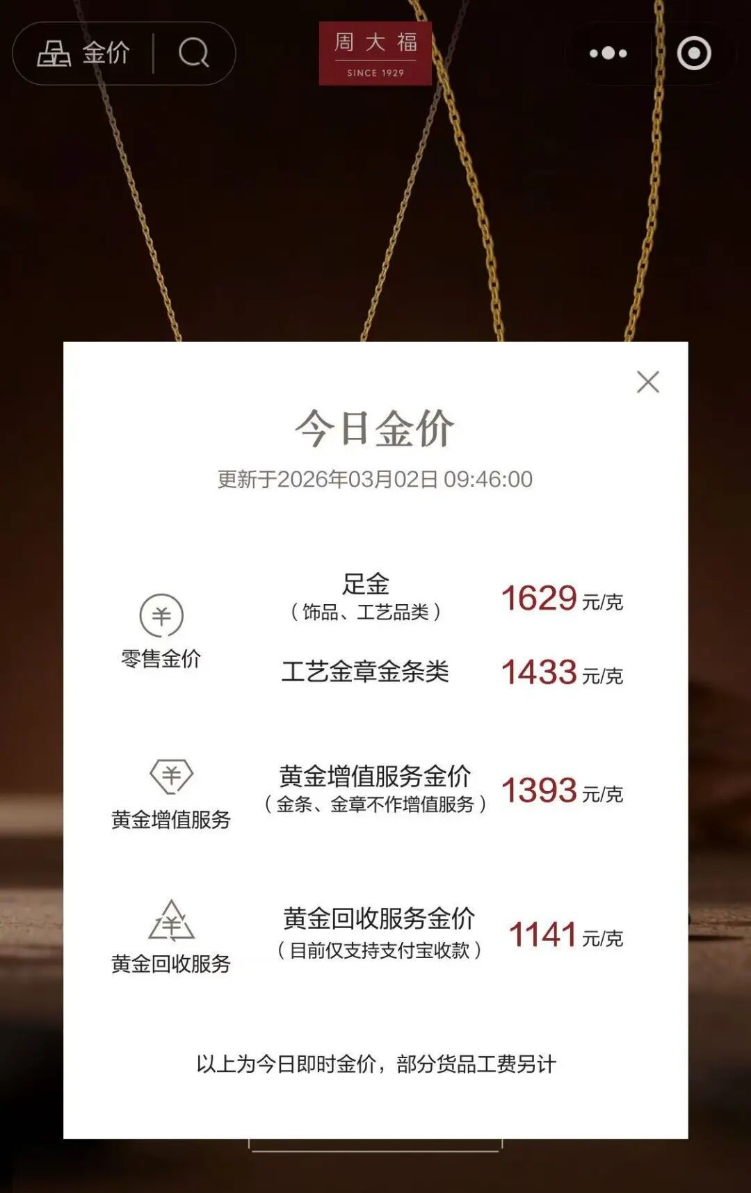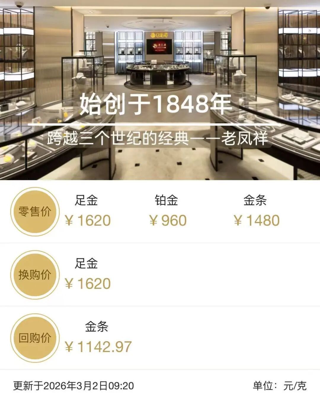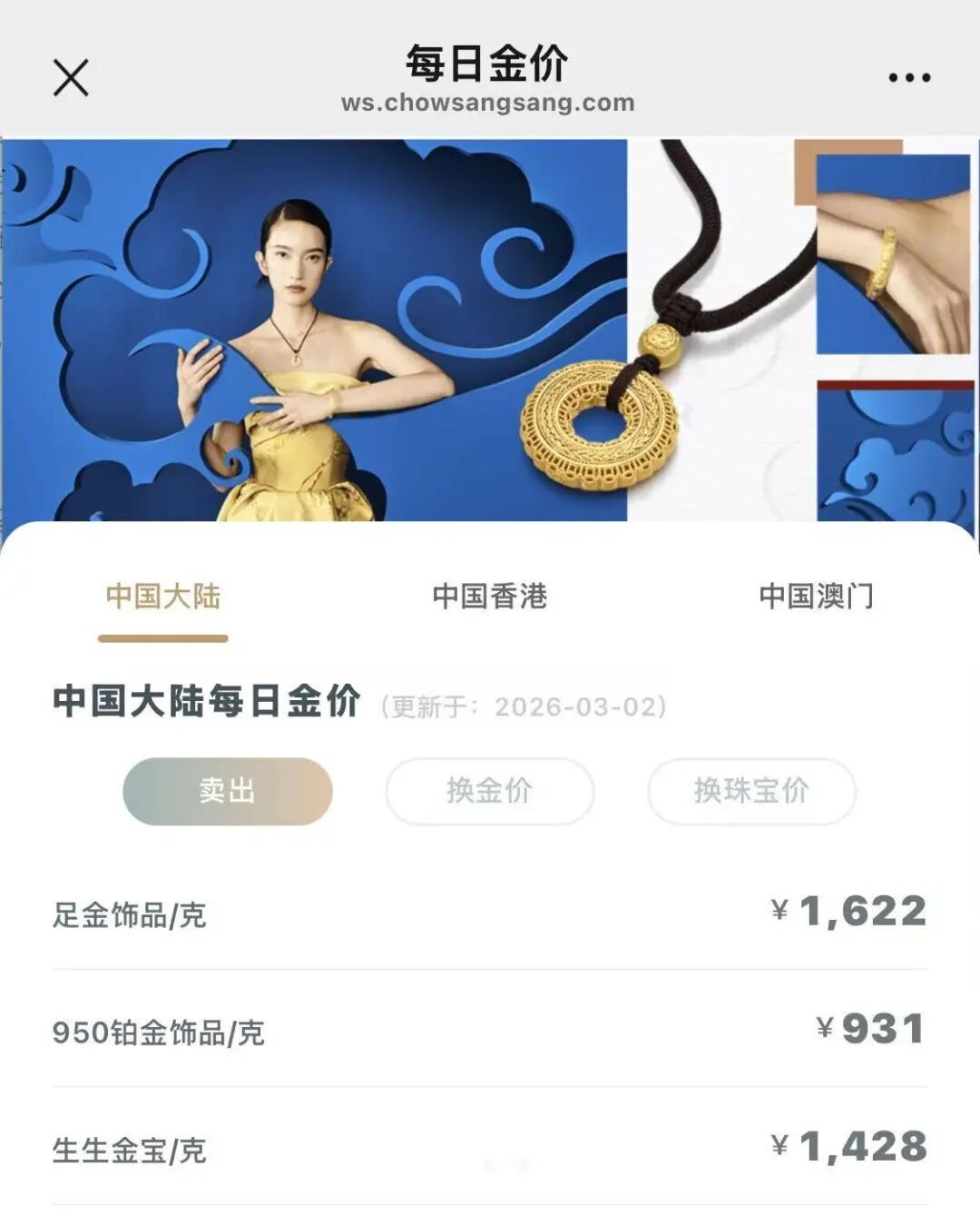 3月2日市场监测显示,国内多数金店的黄金饰品价格较本周末出现上涨,幅度约为20元/克。记者查询发现,目前市场普遍报价已超过1620元/克,其中周大福报价1629元/克、老庙1620元/克、老凤祥1620元/克、周生生1622元/克。