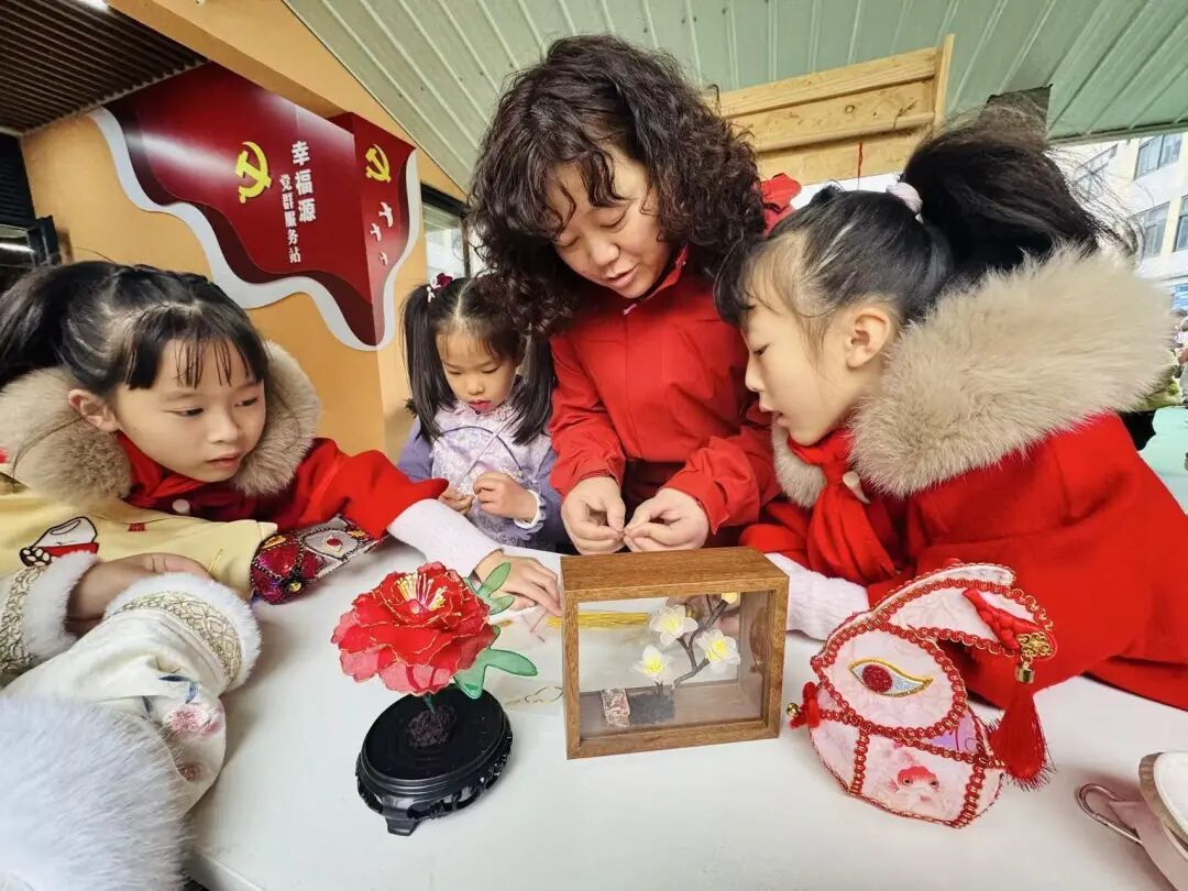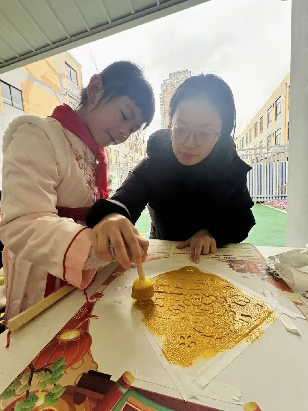 非遗体验区是这一天最热闹的地方。传统游艺区可以套圈、踢毽子、投壶;老字号美食区有梨膏糖、大白兔奶糖;手作区里,拓印、剪纸、泥塑、编织四个社团轮流展示,孩子们能动手体验,DIY的成品可以直接带走。