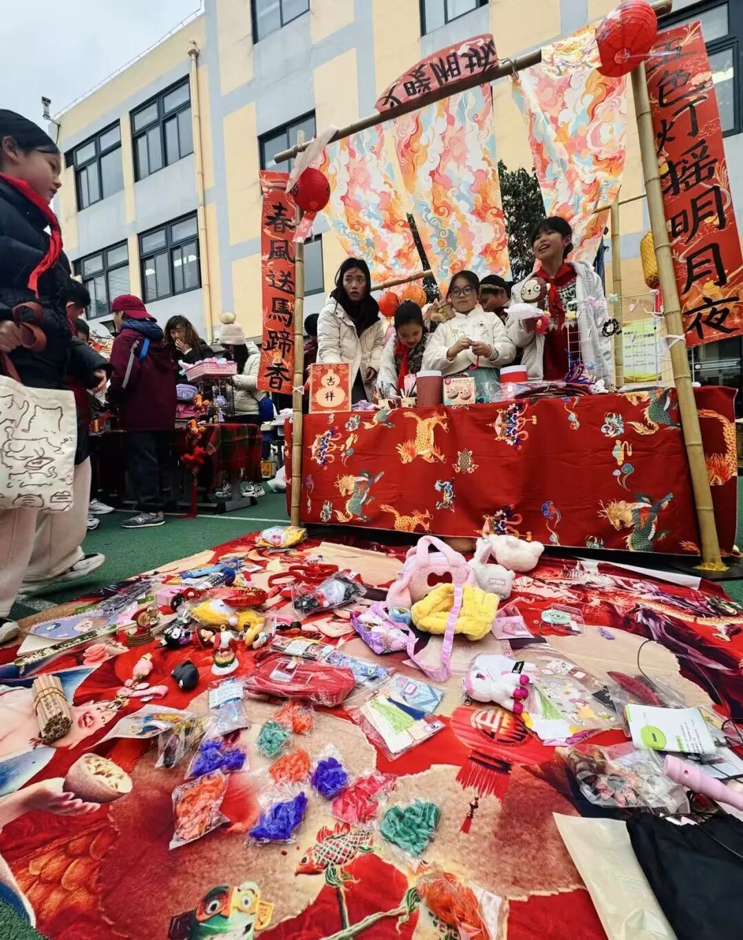 延续往年传统,义卖摊位按照11路公交沿线的老城厢地标设置,每个班级认领一个站点。摊位上摆的东西,和普通的二手义卖不太一样——三年级的学生把语文课上写的灯谜贴出来,猜中的人可以拿走一份小礼物;道法课上学了二十四节气,有老师带着学生在现场剪纸,剪出来的作品直接上架义卖;二年级的学生手里拿着《时间规划任务单》,那是数学课上学完“认识时间”后画的,什么时段去逛非遗体验区、什么时候回摊位帮忙,都提前规划好了。