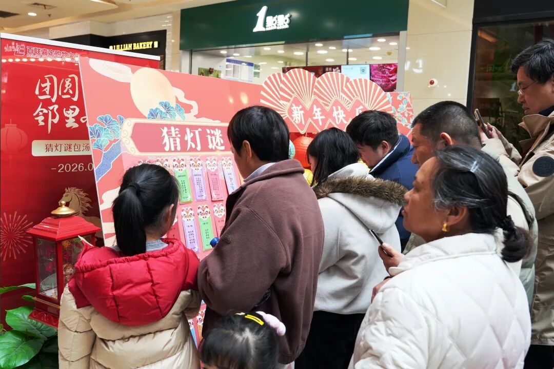 灯谜区更是别出心裁,除了传统字谜,还融入了“新就业群体服务政策”“社区安全小知识”这些实用内容,猜灯谜的同时,也了解了身边的便民信息。商圈负责人也表示,这样的联动,让商场不只是消费的地方,也成了街区的“会客厅”。