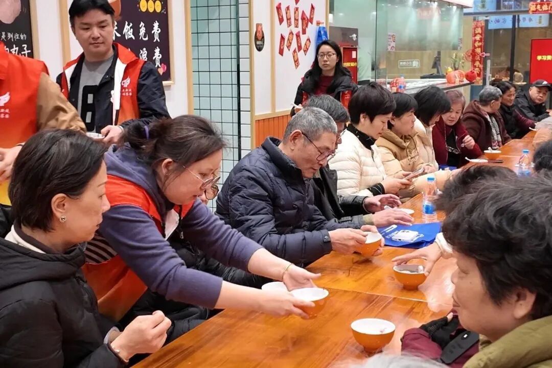 隔壁“新邻里”餐厅里,另一场团圆饭正在进行。这是街区专门为住宅楼宇里60岁以上老人准备的“集体元宵宴”。考虑到老年人的饮食习惯,工作人员特意把汤圆煮软糯,还准备了低糖馅料。