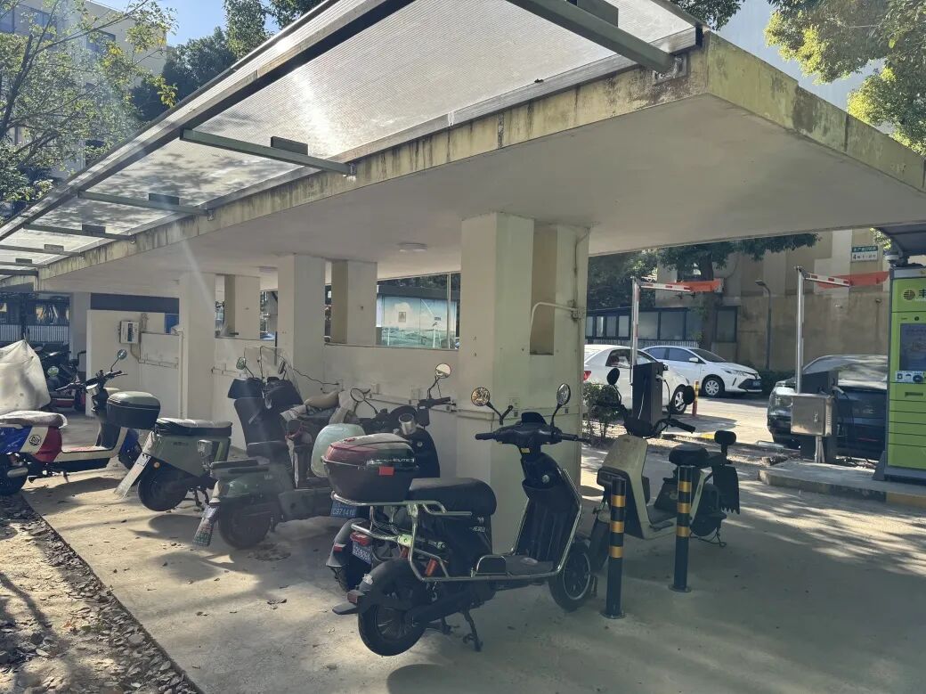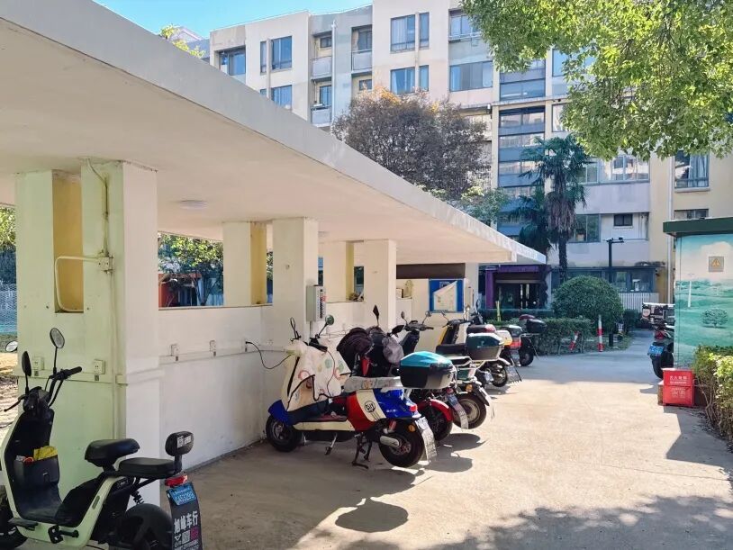 电动车充电难、停放乱曾是困扰居民的心头事。前年小区已增设两个车棚解决该问题,但近期,自治小组成员考察到小区又有不少住户新增电瓶车偶有挤占通行空间的现象。结合居民反馈垃圾堆放问题,本次改造选取在中央废弃绿化区新增一处非机动车棚。改造后的非机动车棚宽敞整洁,棚顶防雨防晒,既规范秩序、消除隐患,也让居民出行更省心。