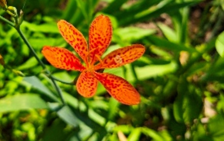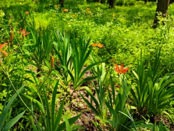 外观习性:多年生草本。茎直立。叶剑形,互生。花橙红色,散生紫褐色斑点。花期6-8月,果期8-9月。