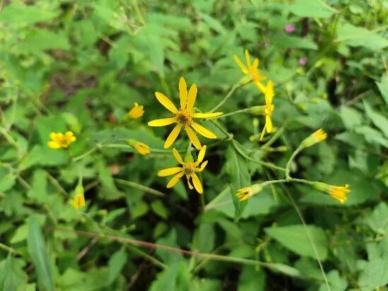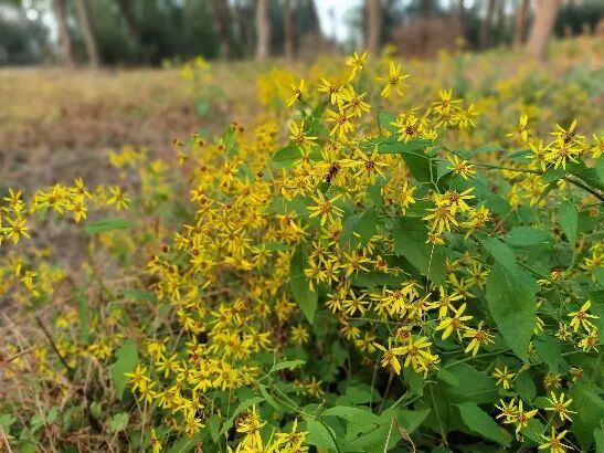 外观习性:多年生攀援草本,茎长2-5米,多分枝。叶卵状披针形或长三角形。头状花序舌状花,排成复聚伞圆锥花序,花黄色,花期10月至次年3月。