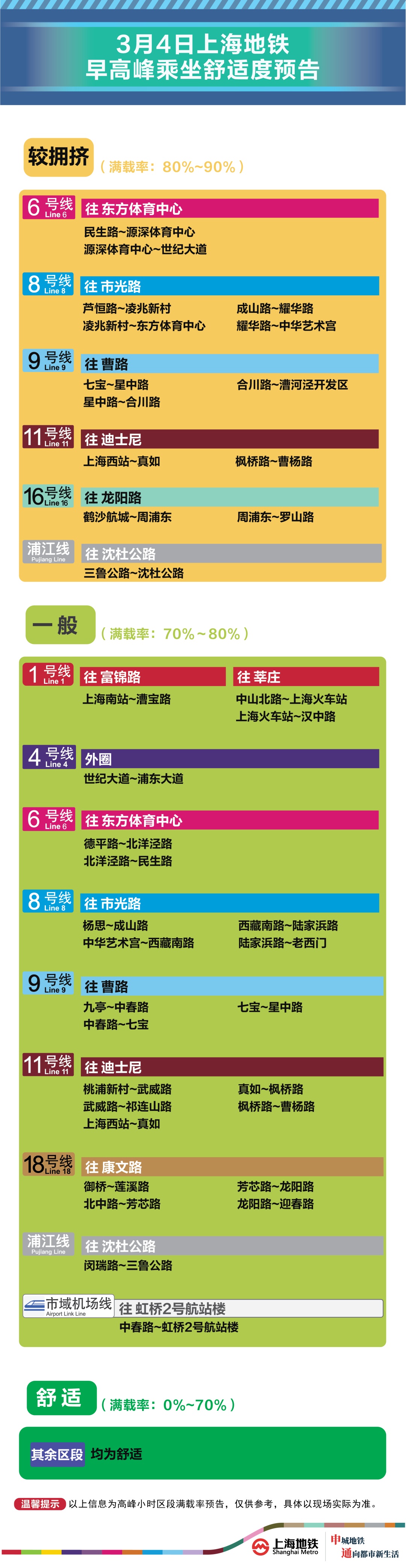 为提升上海地铁早高峰期间出行服务水平,提升乘客乘坐体验,上海地铁向乘客提供乘坐舒适度预告,方便乘客提