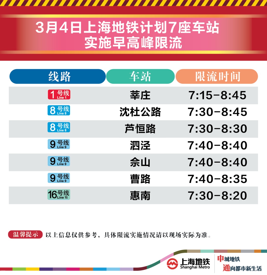 3月4日早高峰莘庄、沈杜公路等7座地铁站计划限流