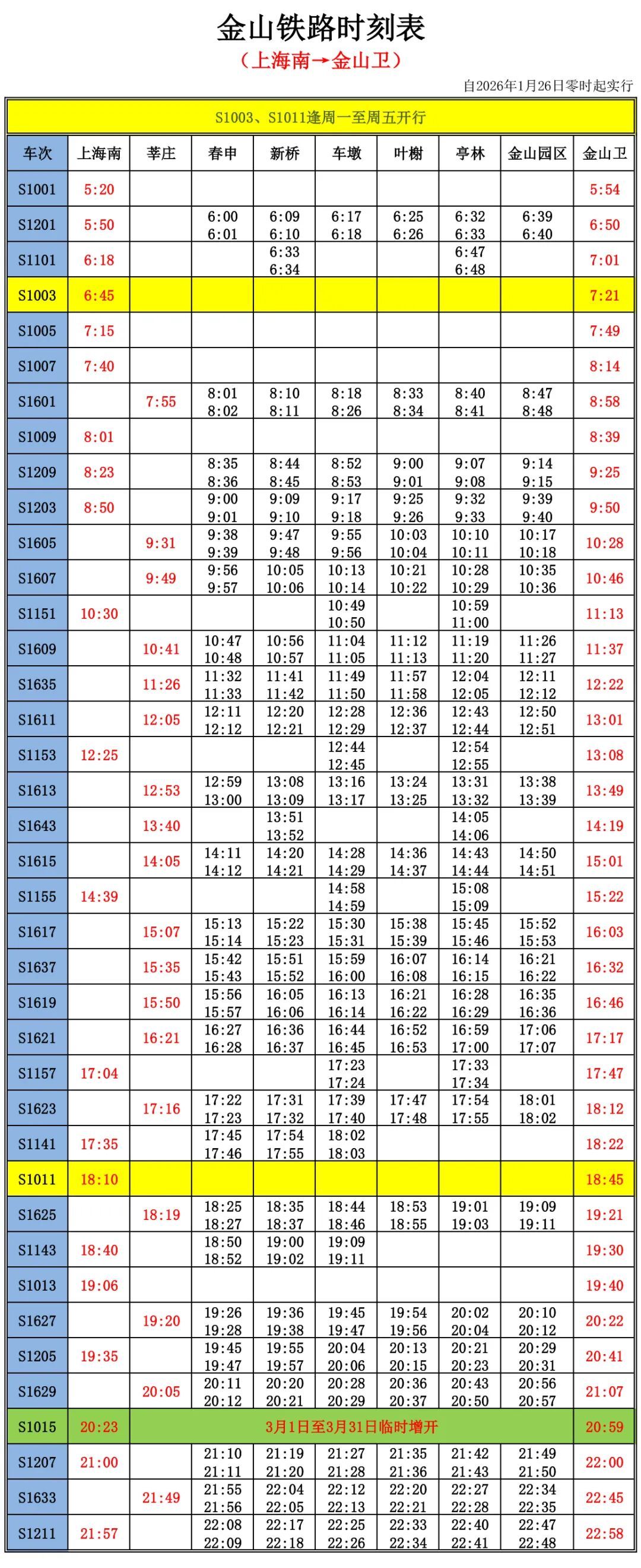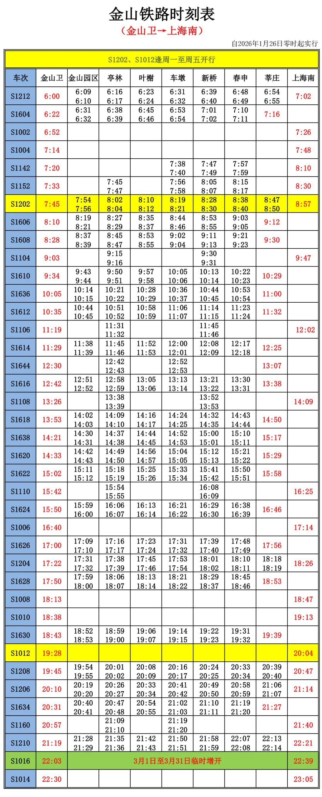 据金山铁路消息,即日起至3月31日,金山铁路临时增开S1015次、S1016次两趟直达列车。