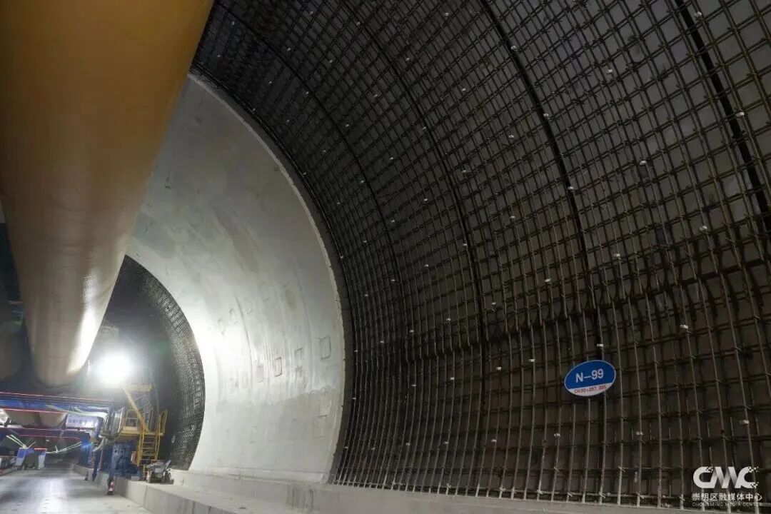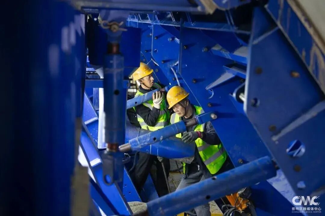 在地下五六十米的崇太长江隧道已掘进空间内,机械轰鸣、工人紧张作业,一台模板台车精准就位,数十名工人正分散在各个点位进行模板加固。