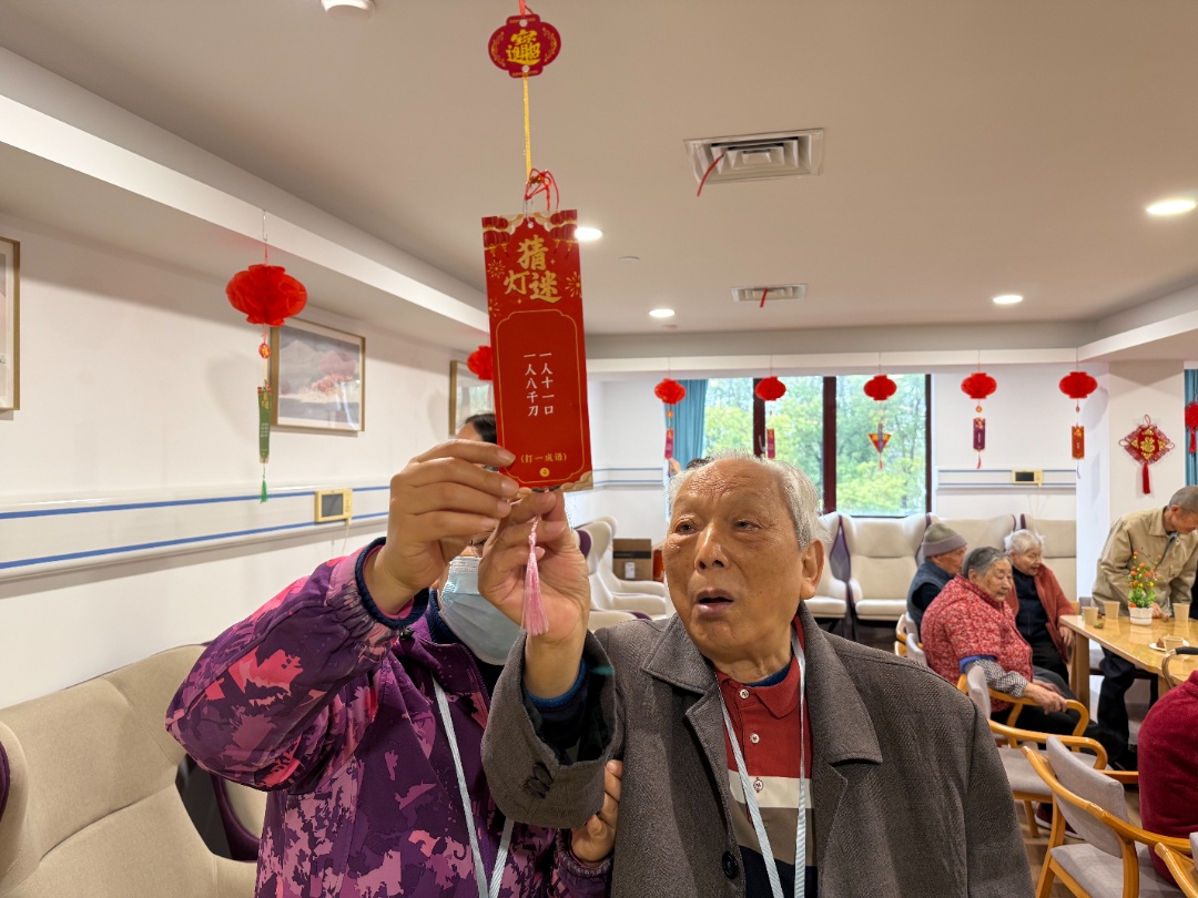 在上海市徐汇区养老事业发展中心一分部,大厅里张灯结彩,五彩灯笼下垂着一条条灯谜,既有民俗典故,也有生活常识,老人们你一言我一语地讨论着。92岁的李爷爷一口气连中三题,引来阵阵掌声,“脑子还灵光着呢!”他笑得爽朗。另一侧的手工区同样暖意融融,工作人员根据长者身体情况准备了软质黏土,一对一耐心指导。老人们捏出“汤圆”“柿子”等小物件,指尖翻飞间,捏出的不仅是节日的象征,更是对日常生活的热爱与期待。