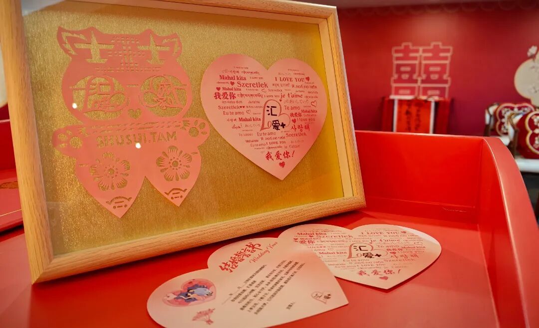 而在徐汇区婚姻收养登记中心,元宵的灯火则见证着另一种团圆。围绕“汇爱”品牌打造的沉浸式婚登体验,把非遗技艺带到了登记现场。非遗剪纸代表性传承人谭树穗特意为新人设计的“汇爱成家”对称传统剪纸,祝福新人成家后婚姻美满,生活甜蜜。剪纸纹样里的“双喜”与“方胜”,织锦封面上的婚嫁文字布,让新人在领证之余,触摸到传统婚俗的文化底色。《吾爱侬999个瞬间》纪念册中,不仅收录甜蜜时光,也嵌入婚姻家庭辅导、法律咨询等服务信息,把“仪式感”与“获得感”结合在一起。