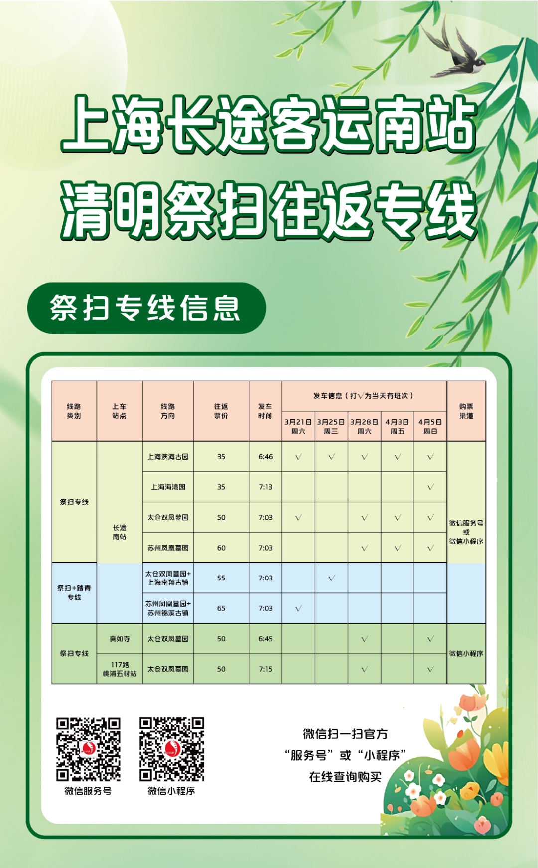 今年结合市民踏青需求,长途南站还首次推出了“祭扫+踏青”一日游线路。两条踏青线路分别是“太仓双凤园+南翔古镇”“苏州凤凰墓园+锦溪古镇”。据了解,祭扫专线为定制线路,行程均为往返出行,在到达墓区2.5小时后返回。而“祭扫+踏青”专线则采用上午墓区祭扫,中午在古镇用餐后,下午游览古镇的行程。从预售情况来看,售票已经过半,站方表示会视后续情况进行加班。有需要的市民可以通过登录“交运巴士”微信公众号、“惠心行”微信小程序,拨打热线电话962168或前往上海长途客运南站阳光岛服务台进行咨询。