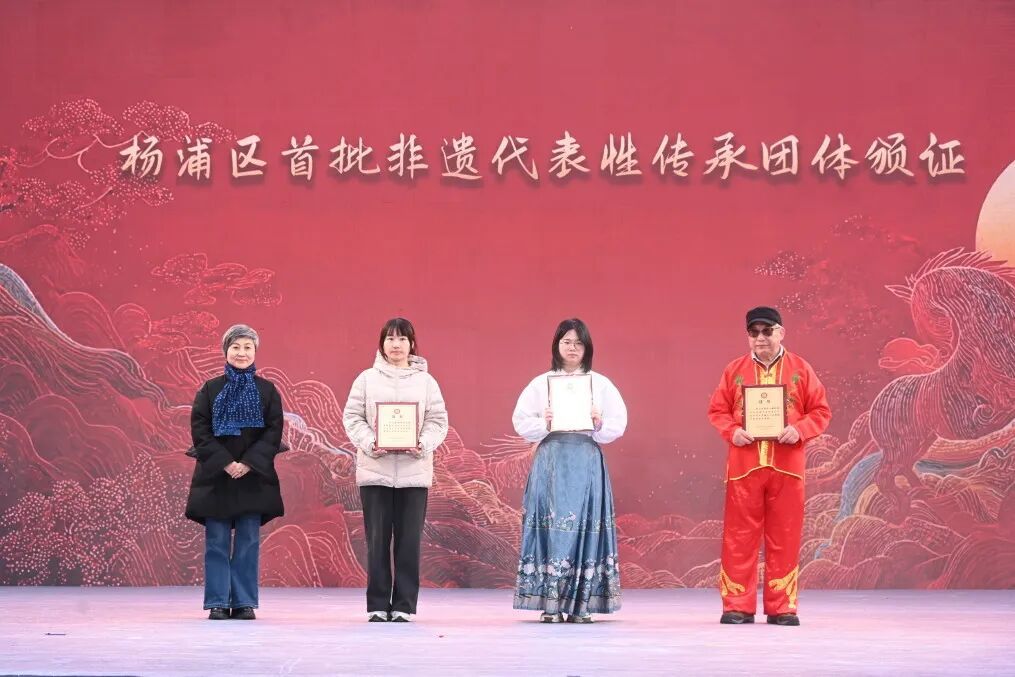 非遗传承,关键在人。活动现场为杨浦区首批3个非遗代表性传承团体及第五批58位非遗代表性传承人中的7位代表颁发证书。目前,杨浦区非遗传承队伍已突破百人,首次实现传承团体“零的突破”,彰显了区域非遗保护工作的累累硕果。