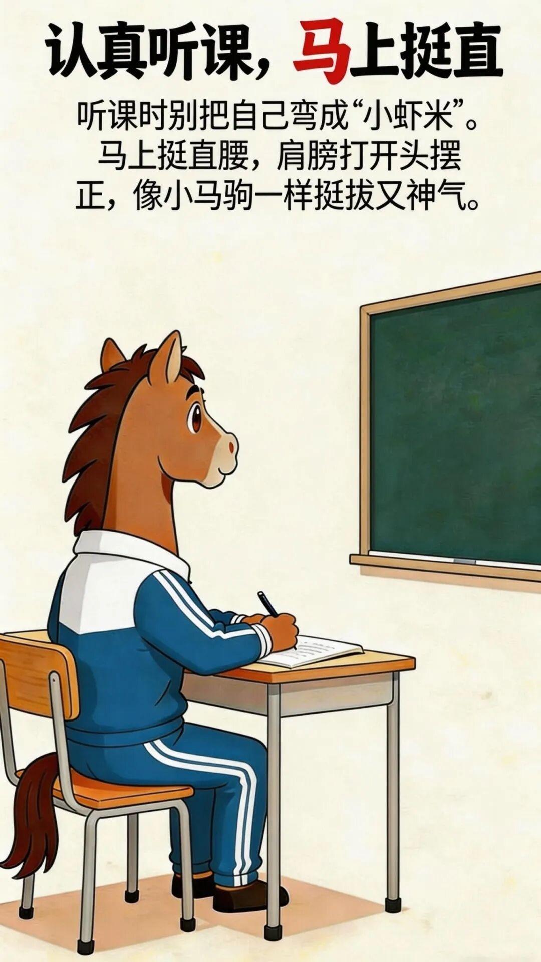 新学期开始啦!不知道小朋友们的状态有没有调整回来呀? 不用担心!正逢农历马年,今天,我们就请专家送给大家五个“马上”,助力学习之路一马平川~ 医学顾问 上海市健康促进中心 吴贞颐 主管医师 黄晓兰 主任医师 认真听课,马上挺直