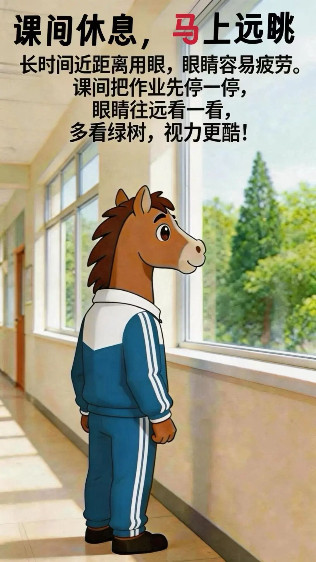 课间休息时,马上放下书本,走到窗边远眺片刻,看看蓝天、绿树,让眼睛的肌肉放松下来,缓解视疲劳、预防近视。