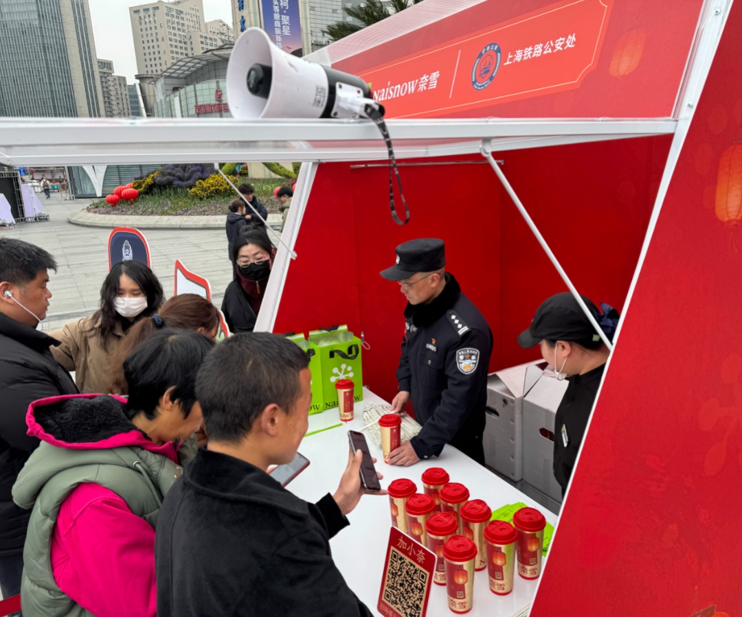 3月3日,上海站派出所携手奈雪的茶,在上海站南广场举办元宵佳节主题活动,为来往旅客送上节日关怀与安全守护。