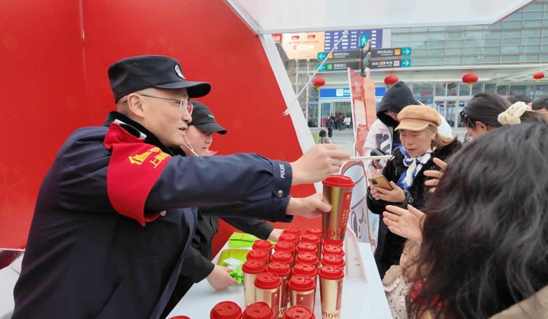 现场吸引了众多旅客的热情参与。民警为旅客递上热气腾腾的奶茶,在传递节日问候的同时,化身“安全讲解员”,面对面讲解反诈防骗技巧与安全出行知识,把平安意识传递给每位旅客。