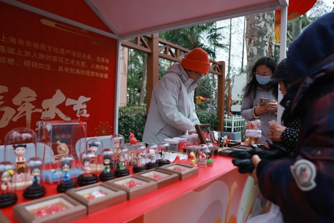 色彩,是面塑摊位的语言。2019年入选上海市非遗名录的江湾面花,在传统海派面塑之上融入了新的艺术元素。传承人指尖翻飞,不一会儿,一个眉眼传神的古代仕女便跃然掌上。
